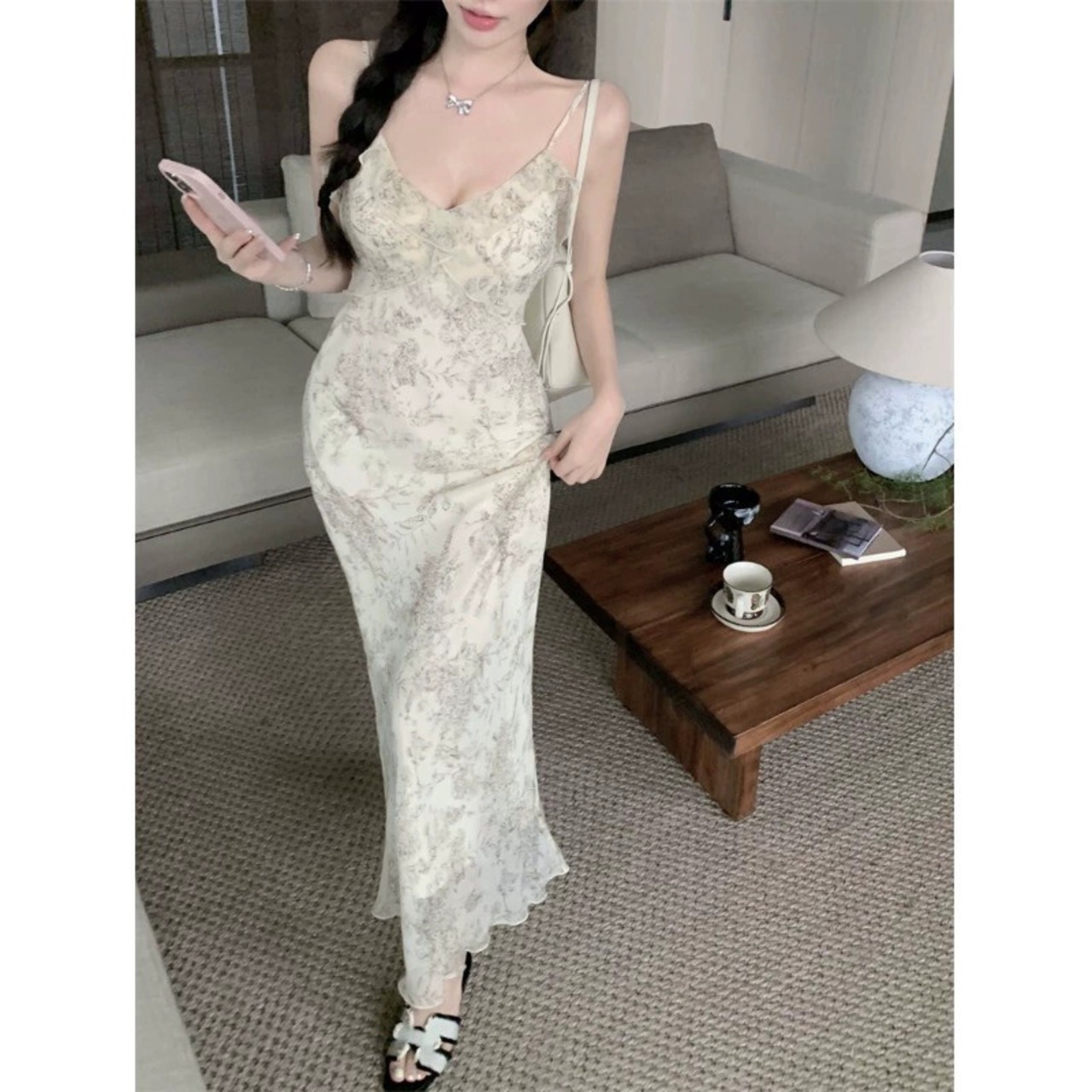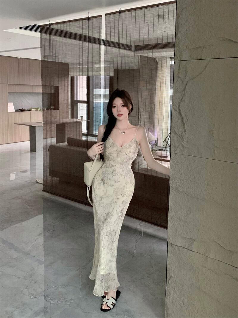 フレンチクールフローラルVネックサスペンダードレスレディースサマーシフォンスカートピュアラストスタイルスリムヒップカバーロングスカート 夏物 花柄 0921969095123428