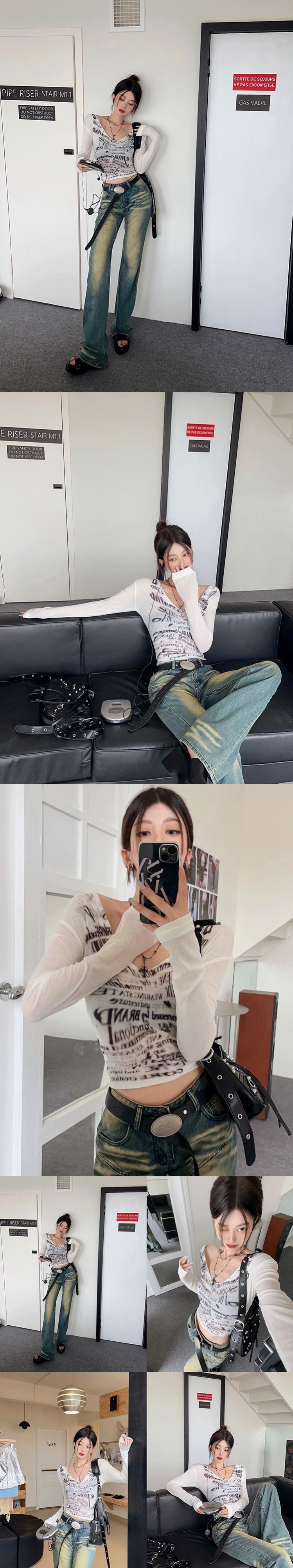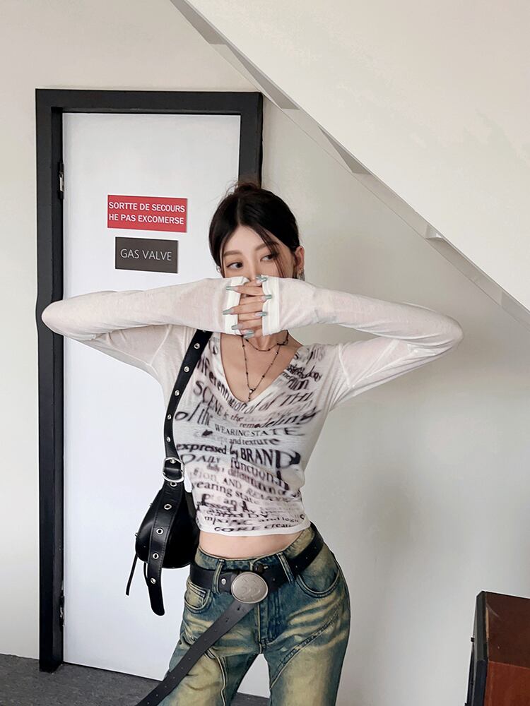 ホットセクシーなレタープリント v ネック長袖 Tシャツ女性の夏の 2023 新しいショートスタイル痩身日焼け止めトップ ロング サマー 夏物 Vネック 0921957048695774