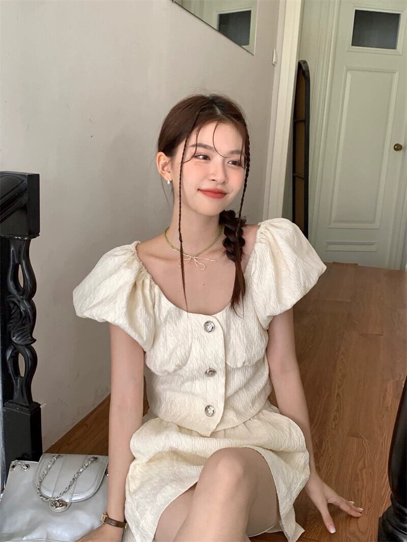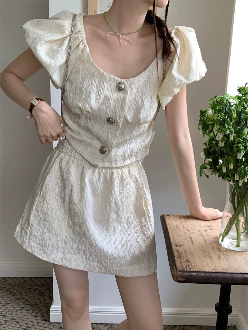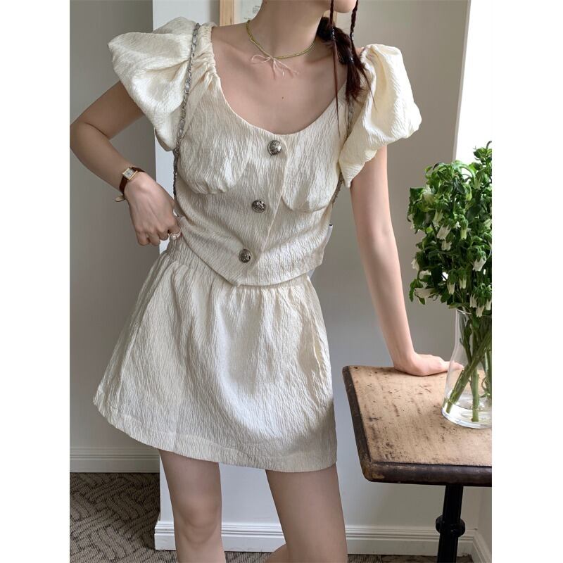 フレンチジェントルスタイルスーツスカート女性の夏 2023 新しい気質パフスリーブショートシャツスカート 2 点セット サマー 夏物 0921924233832710