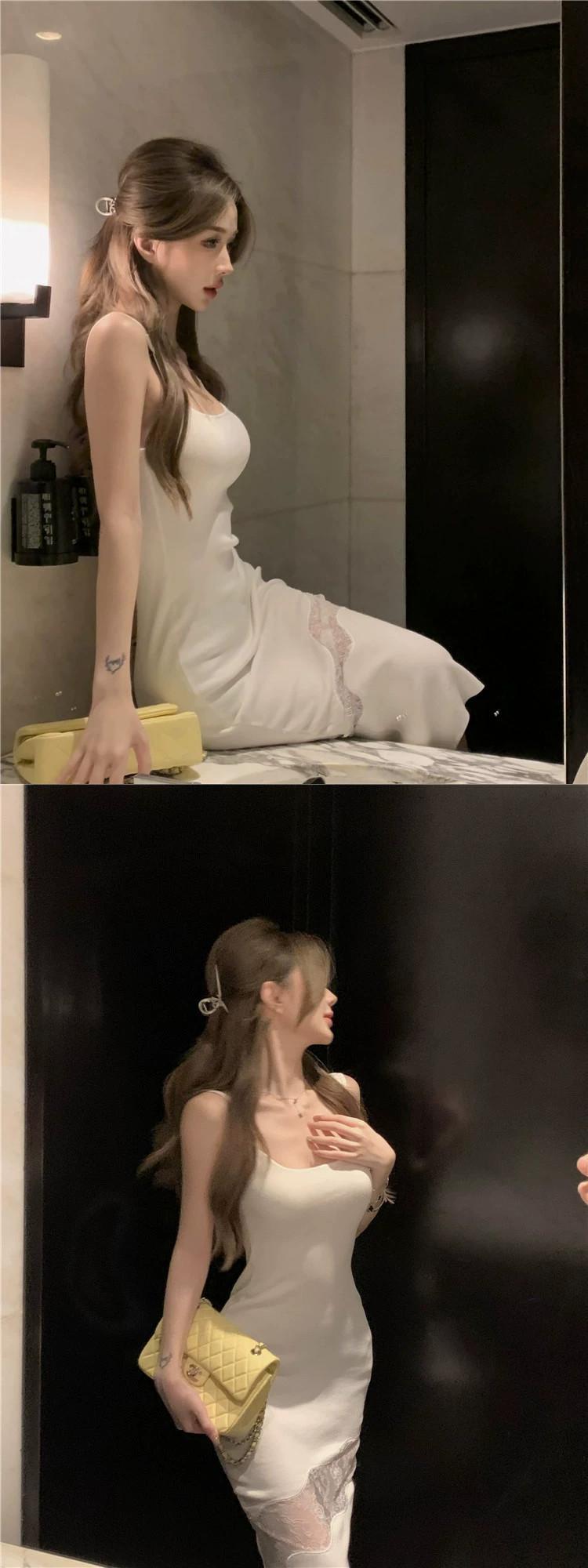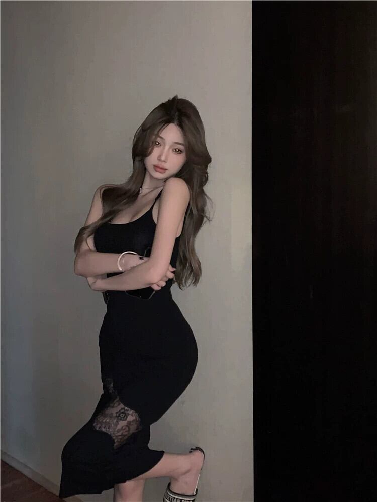 セクシーなレースのスプライシングサスペンダードレスの女性の夏 2023 新しい純粋な欲望スタイルウエスト痩身ヒップカバーニットスカート サマー 夏物 ピュア 0921982533965906