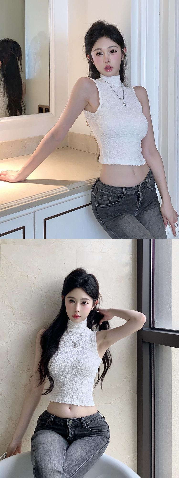 甘くてクールなハーフハイカラーノースリーブベストの女性は夏のニッチなテクスチャーで屋外で着用できるスリムなショートトップを着ます 大人ガーリー スウィート キュート カジュアル サマー 夏物 0921955593064218