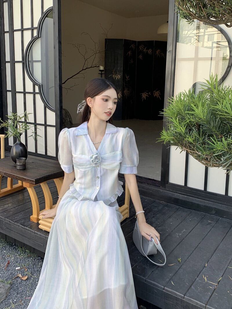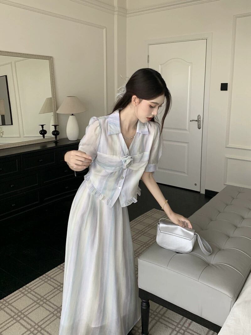 Atmospheric スーツ レディース 2023 夏 ストライプ プリント トップス ウエスト スリム スカート 2 点セット サマー 夏物 0921963918794633