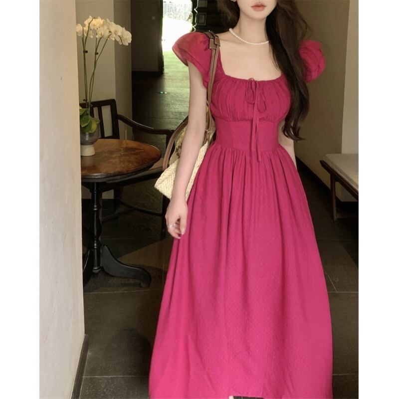 レトロスクエアネックピタヤカラードレス女性の夏の小さなフライングスリーブロングスカート甘い気質ウエスト痩身 A ラインスカート 大人ガーリー スウィート キュート カジュアル サマー 夏物 Aライン スクウェア 0921932248386761