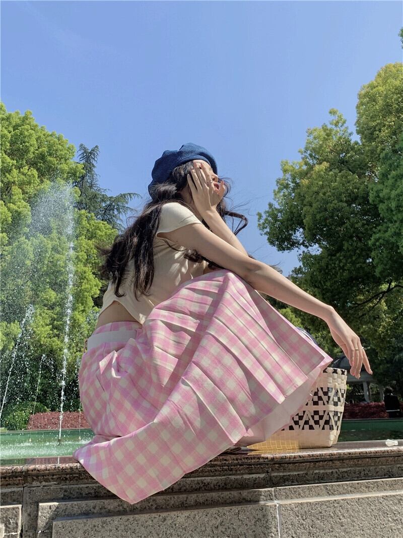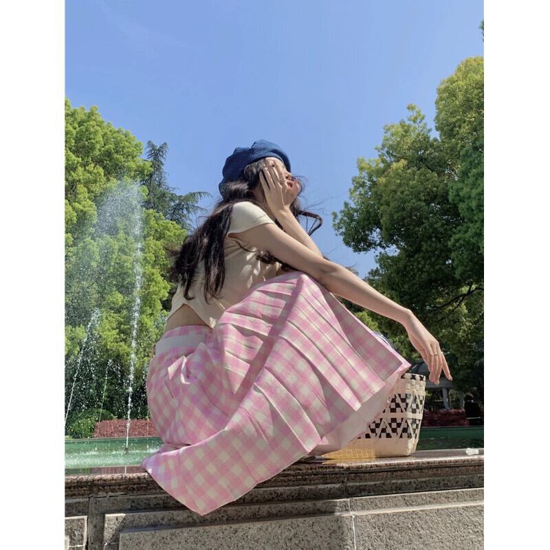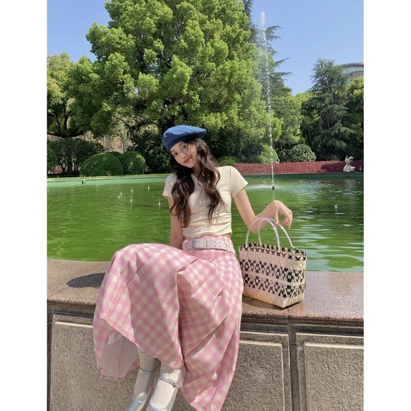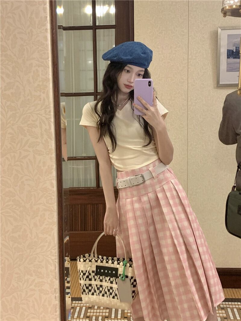 老化スーツの女性の夏 2023 新しいピンクチェック柄プリーツロングスカート v ネックボトミングトップ 2 点セット サマー 夏物 Vネック 0921934255420684