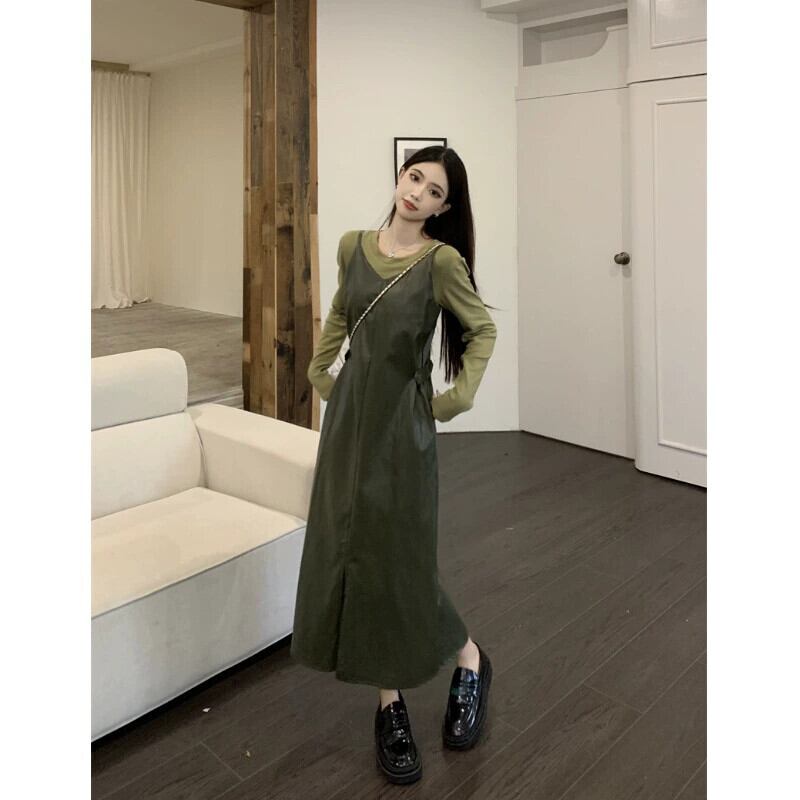 -end 気質スーツスカート女性初秋 2023 新しい pu レザースリットサスペンダースカート長袖ボトシャツ 2 点セット ロング オータム 秋物 0921967050442963