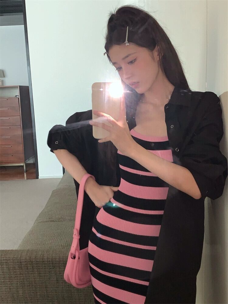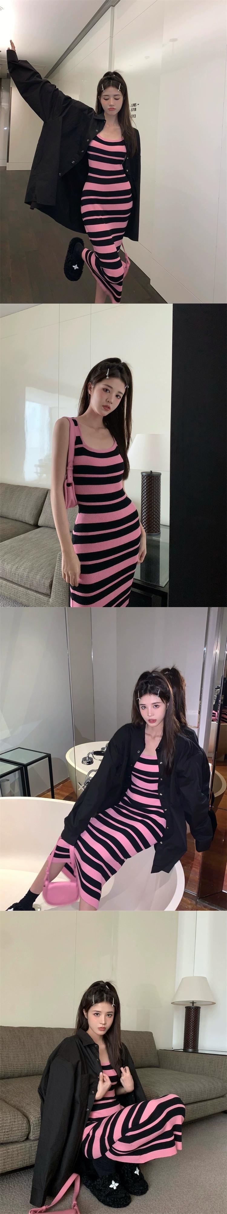秋のホットなストライプのサスペンダードレスの女性、スリムでシック、甘くてスパイシーなニットスカートとミドル丈のスカート 大人ガーリー スウィート キュート カジュアル オータム 秋物 0921928103167752
