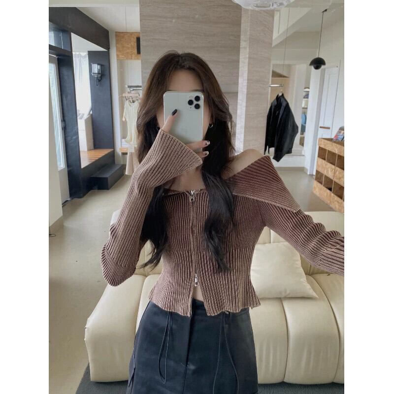 気質スタイルのワンライン襟長袖セーターの女性の秋 2023 新デザインのグラデーションダブルジッパーカーディガン ロング オータム 秋物 0921938027736350