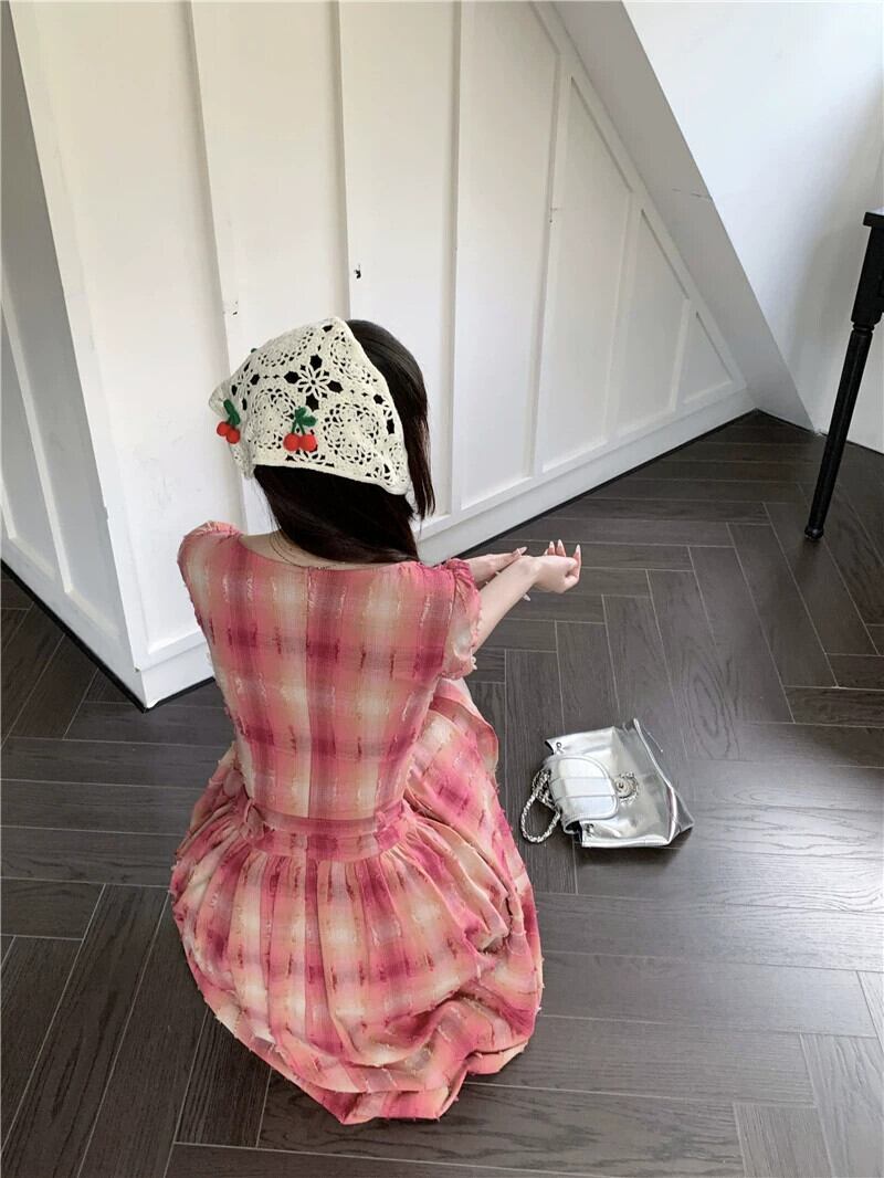 レトロな赤のチェック柄半袖ドレスの女性の 2023 夏の新デザインのストラップウエスト A ラインロングスカート レッド サマー 夏物 Aライン 0921959308361060
