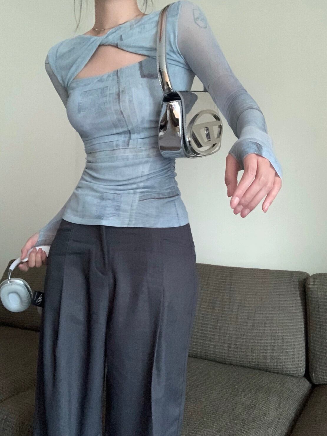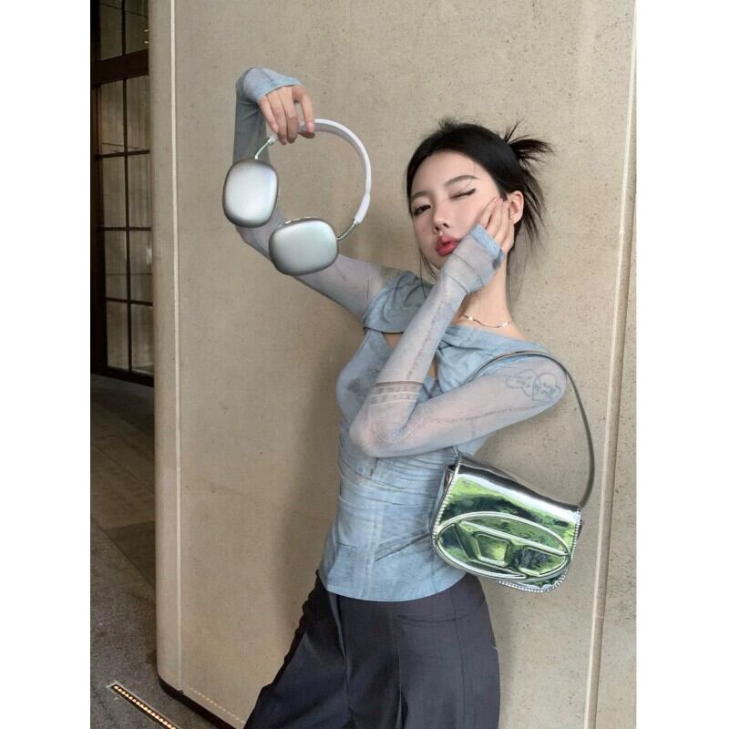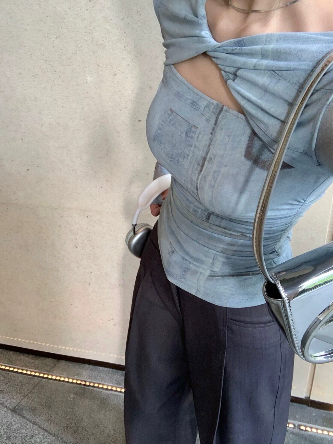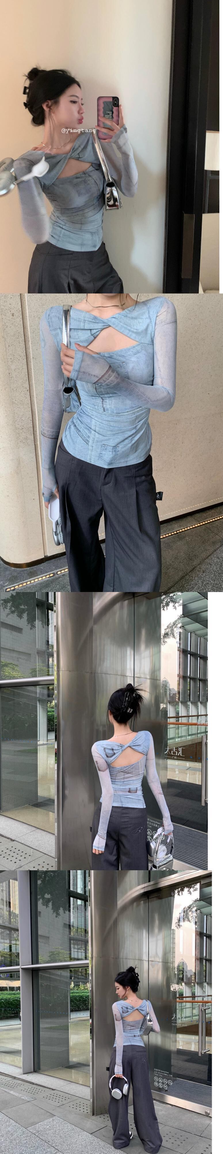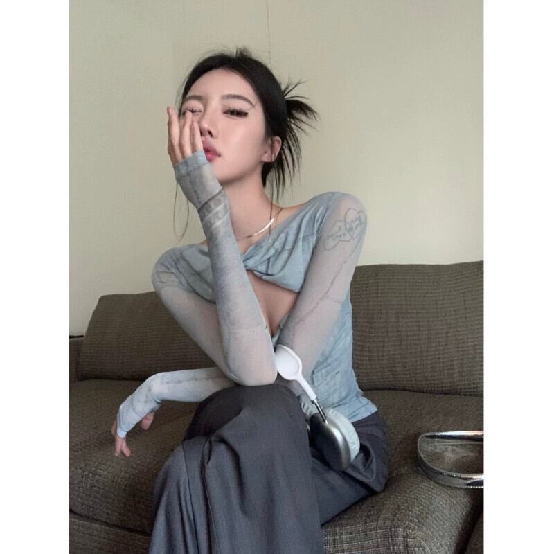 ニッチメッシュツイスト長袖 Tシャツ女性初秋 2023 新デザイン中空痩身ショートトップ ロング オータム 秋物 092196169422341