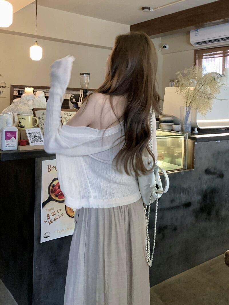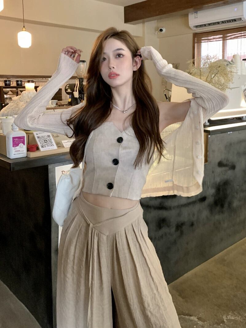 スーツ レディース ノースリーブ チューブトップ 夏 長袖 日焼け止め カーディガン オーバーオール カジュアルパンツ 長ズボン 3点セット ロング サマー 夏物 0921978344076418