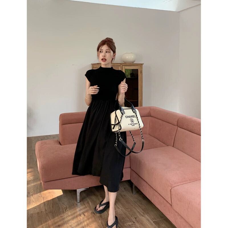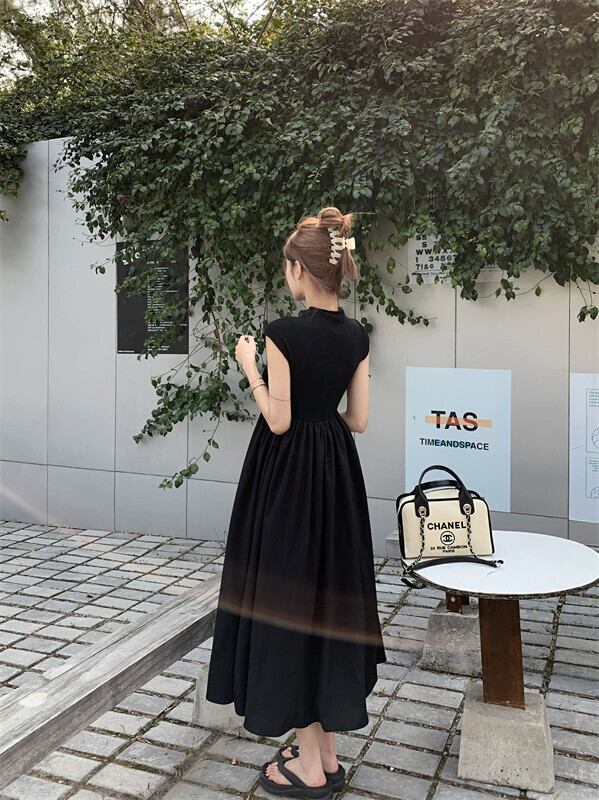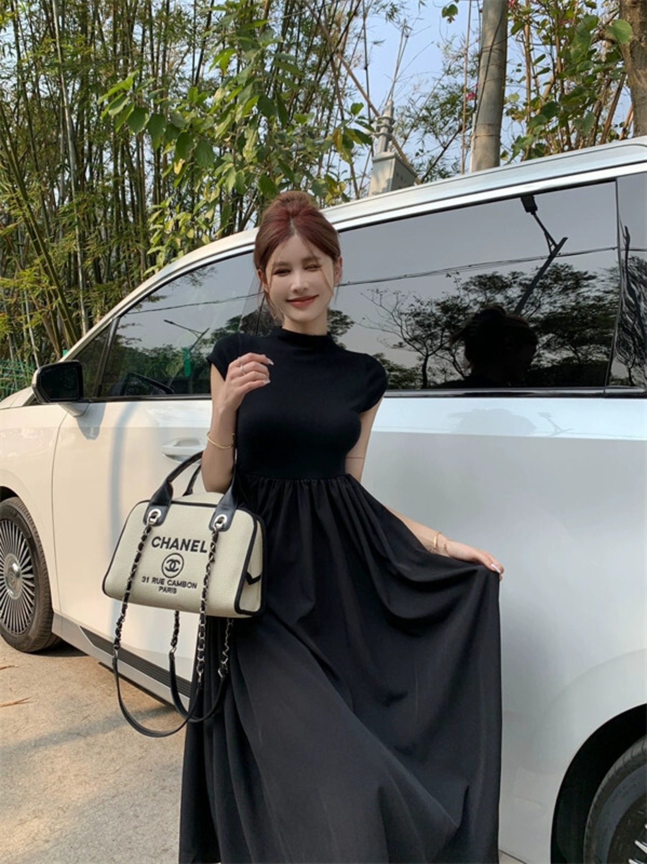 黒ハーフタートルネック半袖ドレスの女性の夏フレンチティーブレイクスカートスプライシング気質とハイエンドのaラインロングスカート ブラック サマー 夏物 0921943805983955