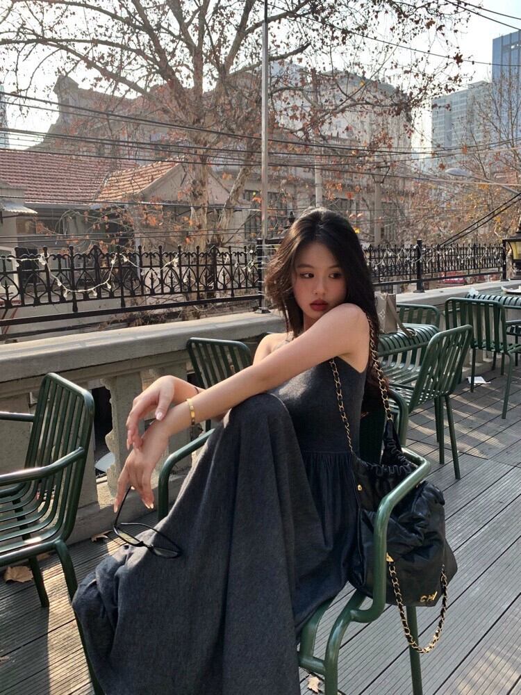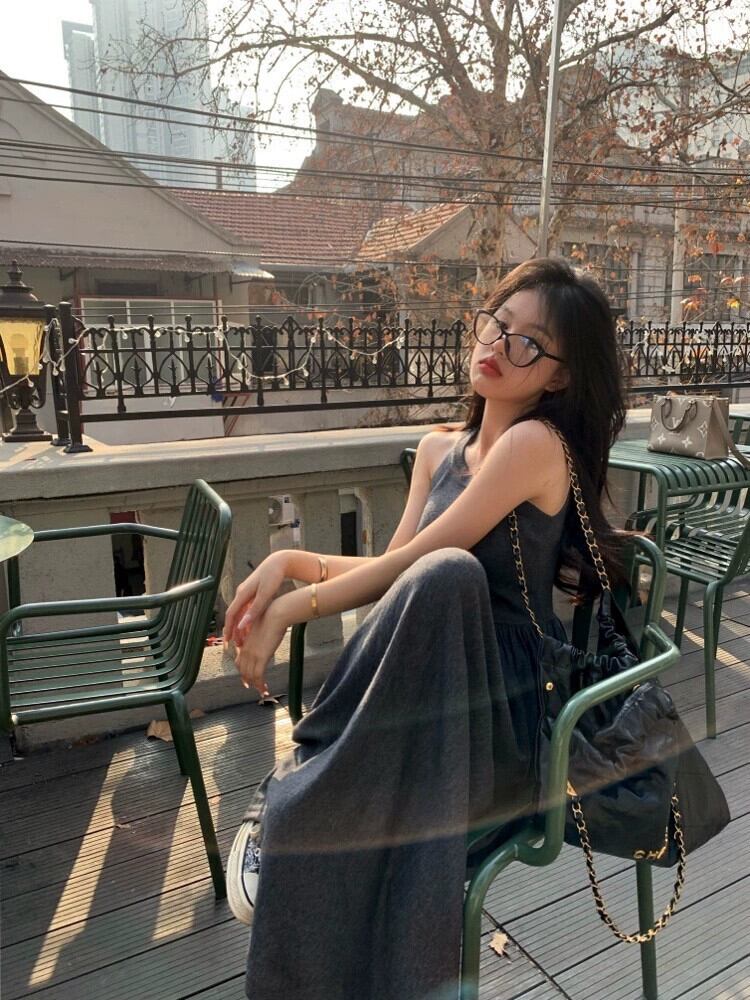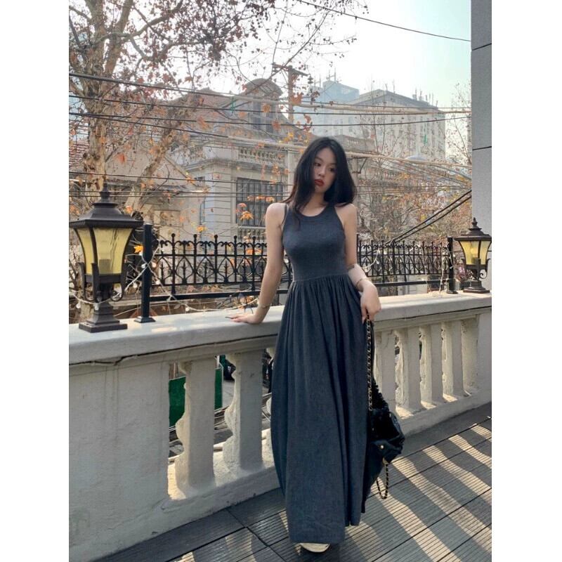 怠惰なスタイルのレトロなグレーのノースリーブニットドレスの女性の夏の 2023 新しいミッドレングスウエストとワイドスカート サマー 夏物 0921973395274835