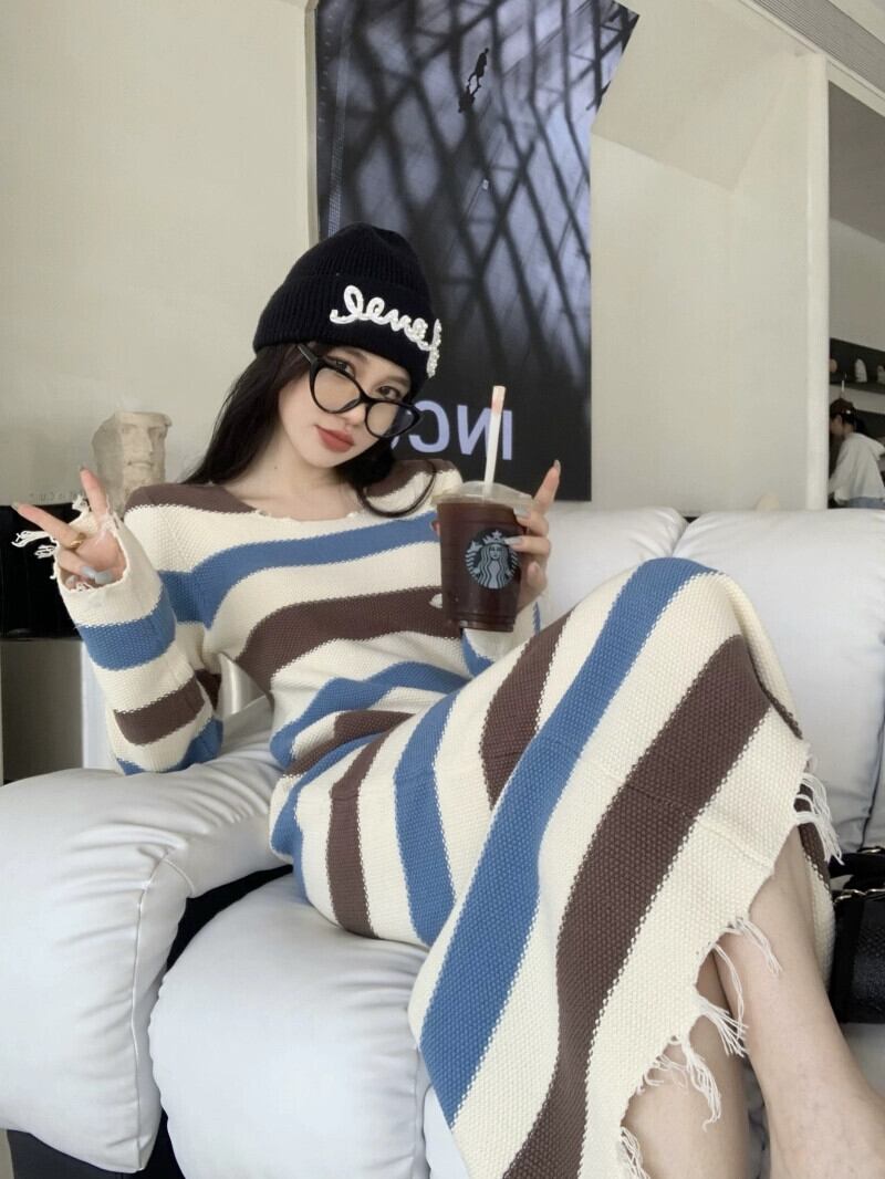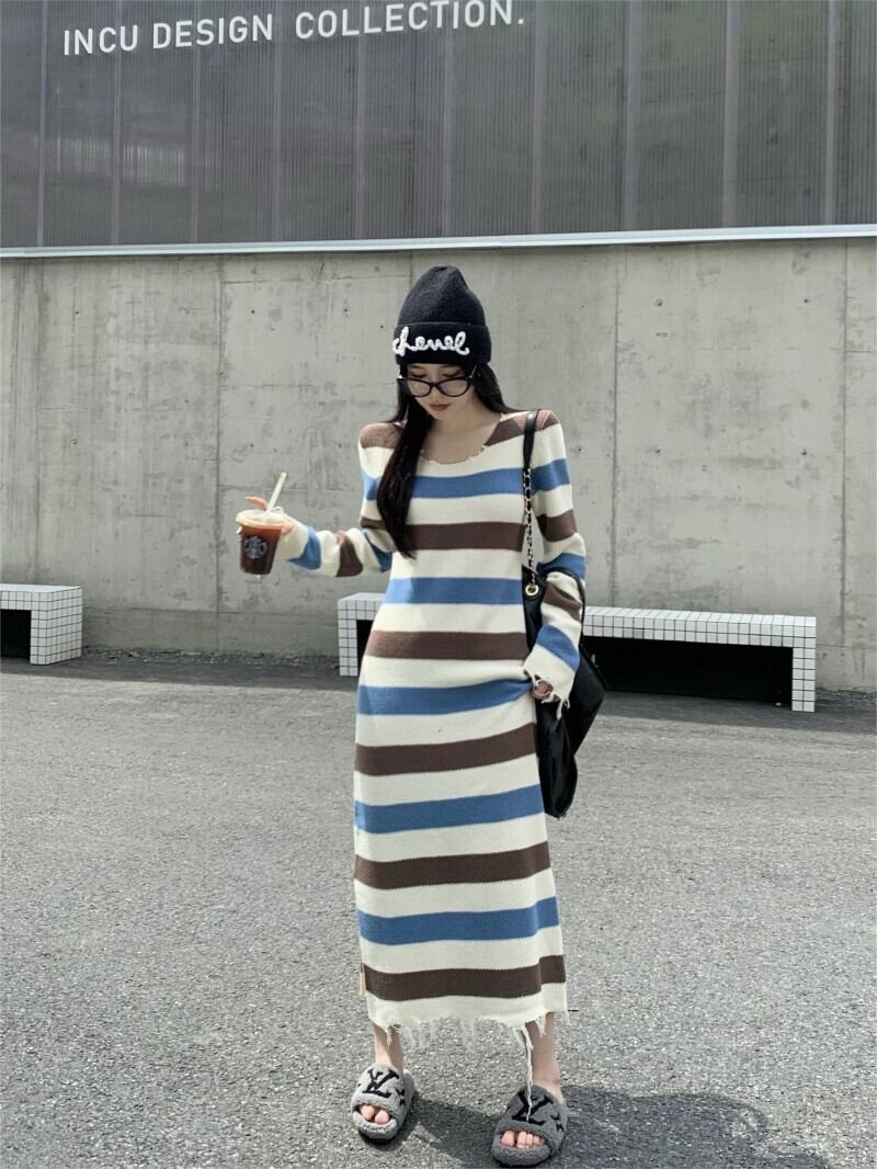 コントラストストライプ長袖ニットドレス女性秋 2023 新バージョン痩身スリム気質 A ラインロングスカート オータム 秋物 Aライン 0921914416798858