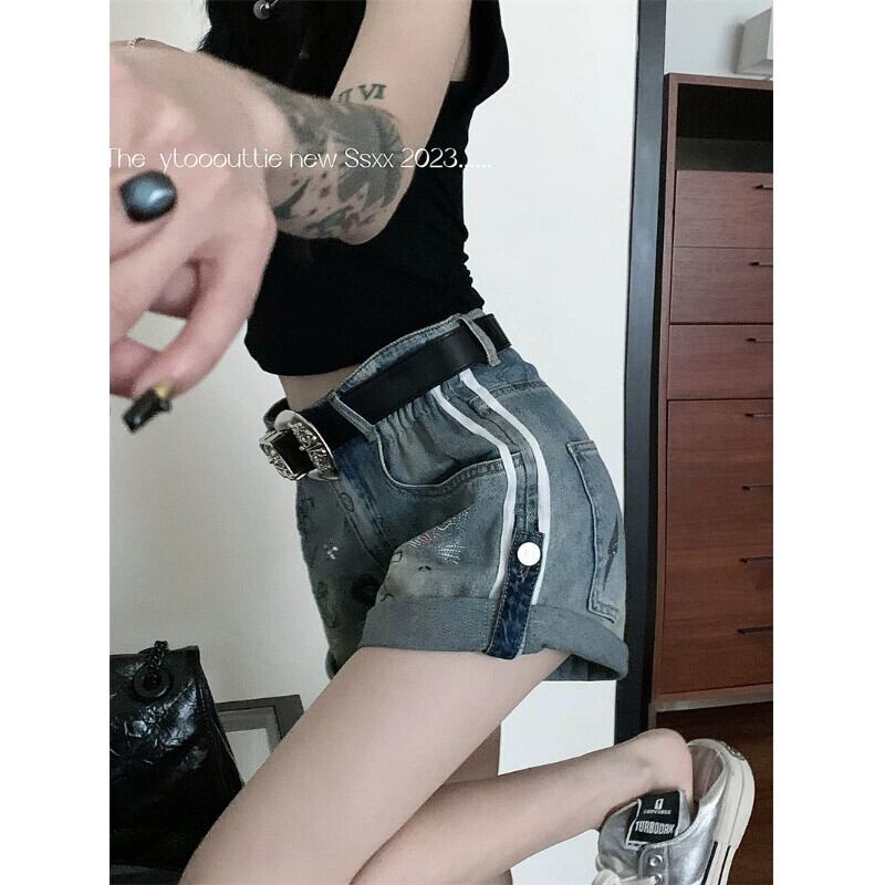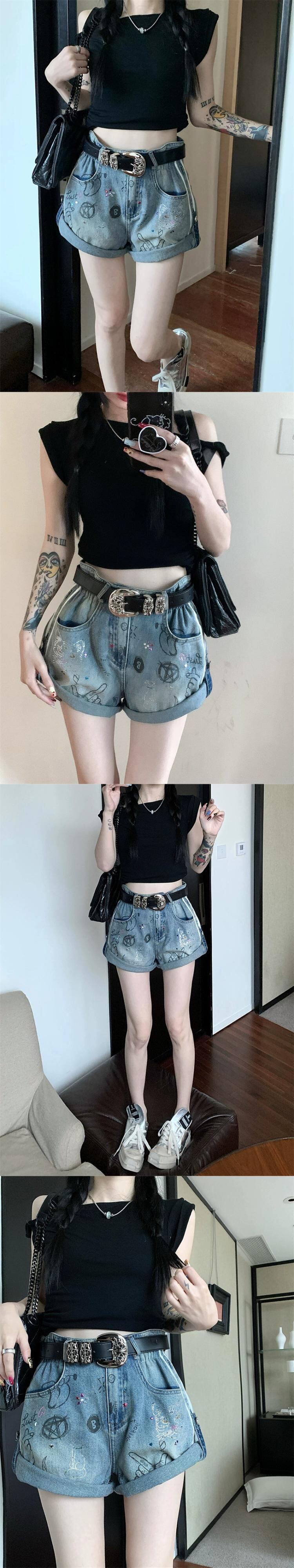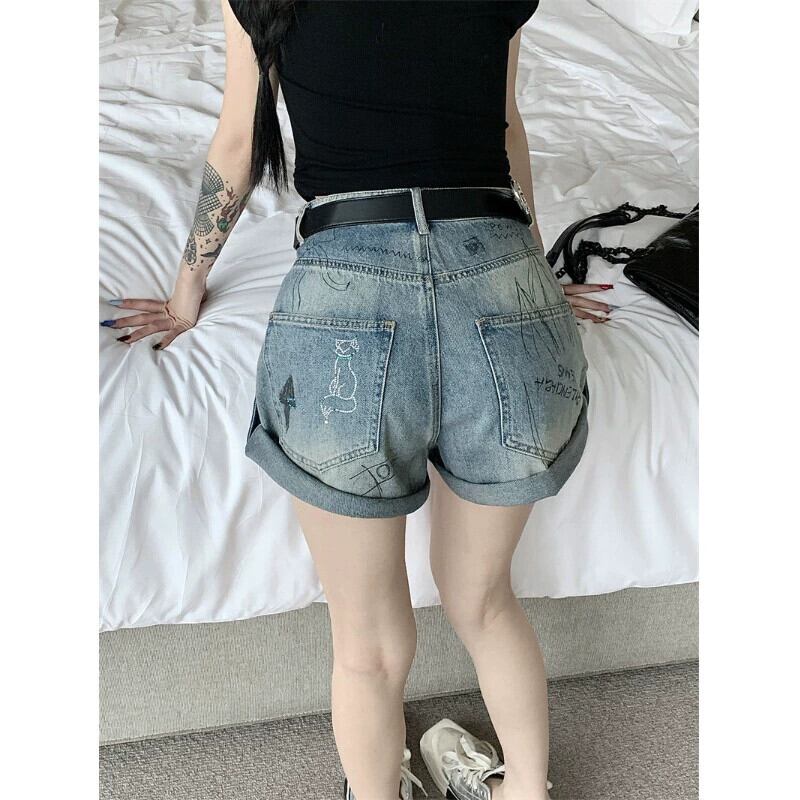 ED プリント ブルー デニム ショートパンツ レディース サマー パンツ、ハイウエスト、スリム、ルーズ ワイドレッグ A ライン パンツ 夏物 ショーツ ブルマー Aライン 0921985615015818