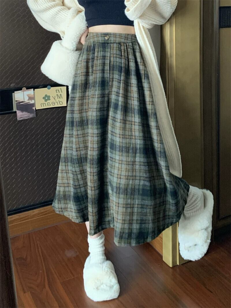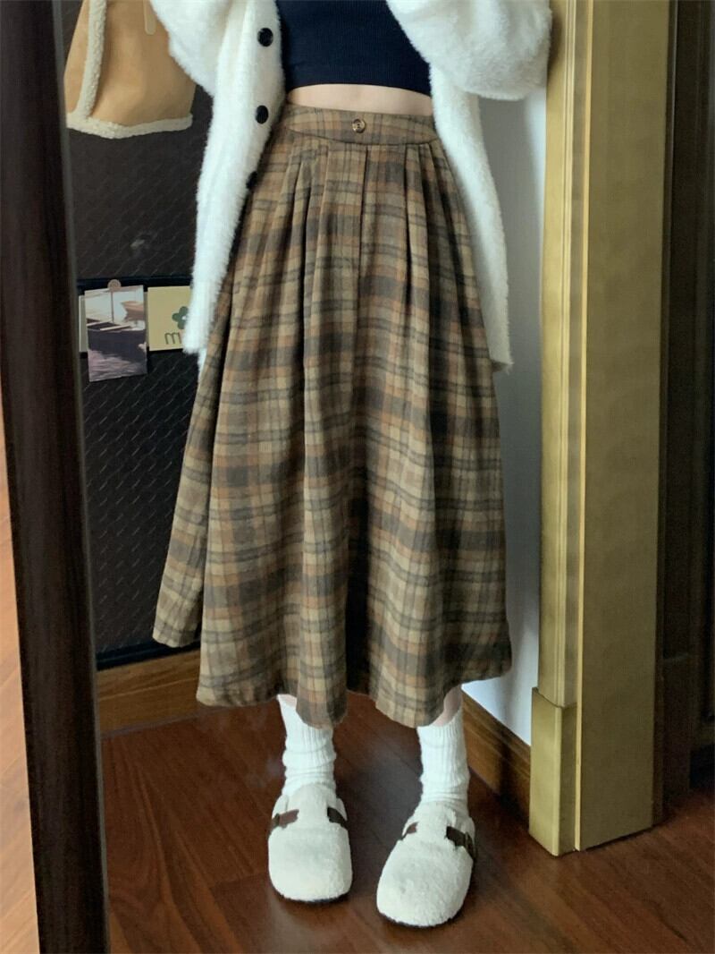 レトロウールチェック柄ハイウエストスカート女性秋 2023 新しいスタイルの a ラインスリムで多用途なミドル丈スカート、大きな裾 オータム 秋物 Aライン 0921961060857036