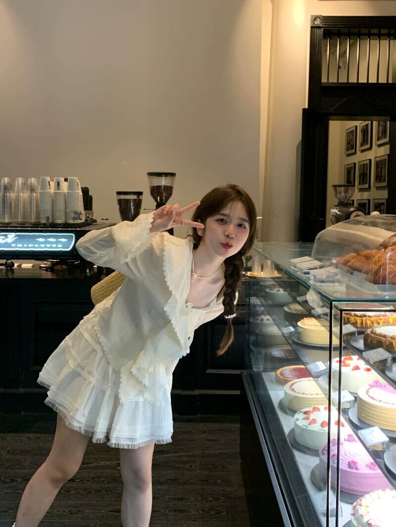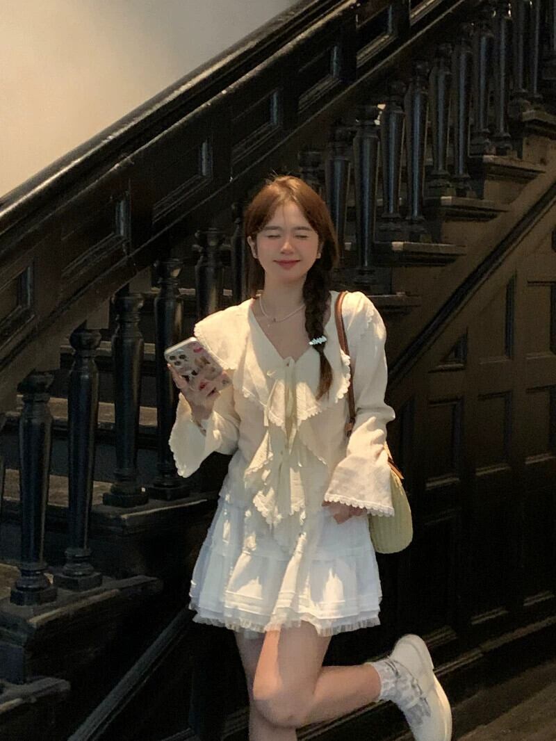 フレンチレトロレースフリルベルスリーブシャツトップレディース夏ウエストAラインスカート2点セット サマー 夏物 0921968862742033