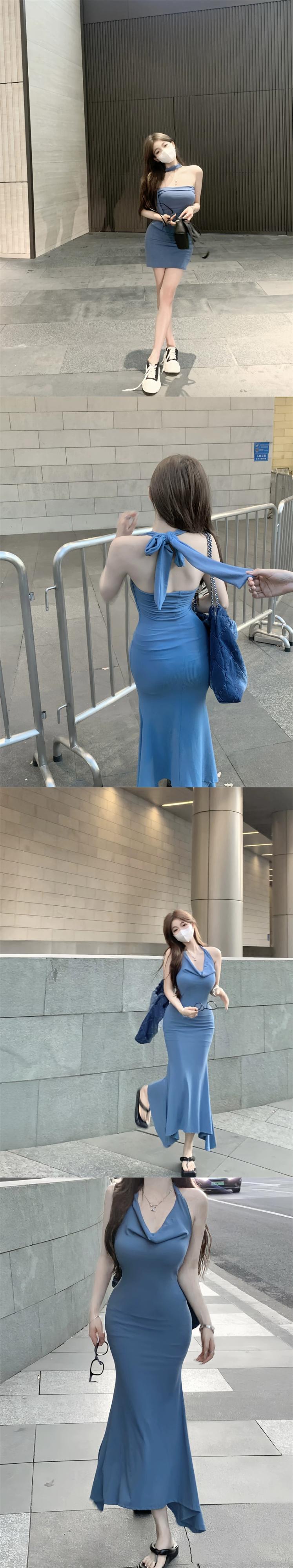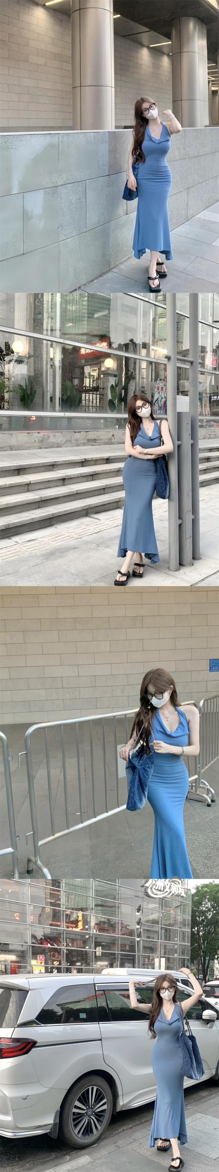 夏のグリーンフレンチホルターネックサスペンダードレスレディース、純粋な欲望スタイルのスカート、ハイエンドの気質、フィッシュテールヒップハグロングスカート サマー 夏物 ピュア 0921970962102903