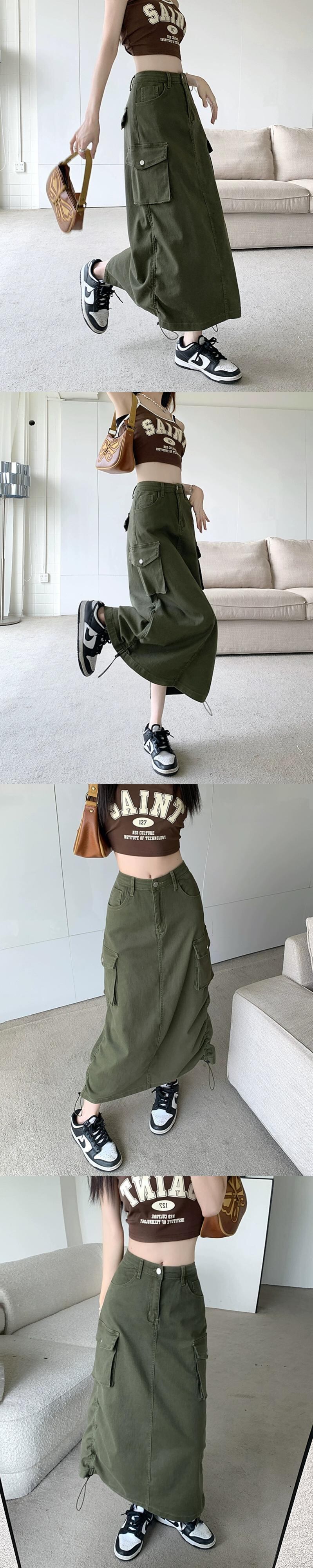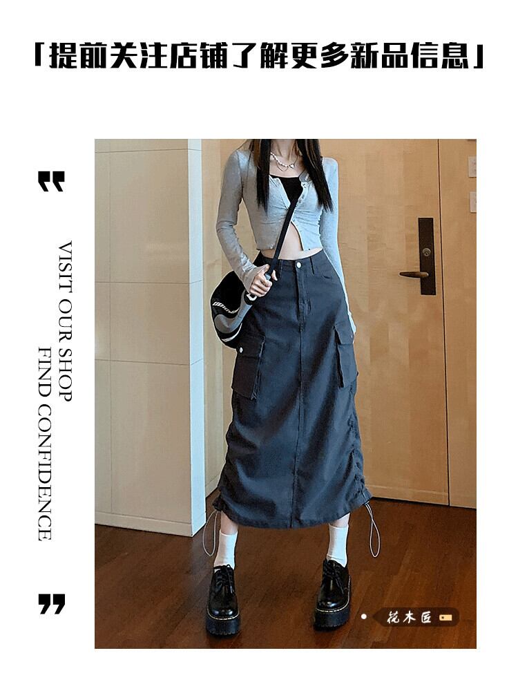 レトロワークウェアデニムスカート女性秋デザイン巾着ハイウエスト痩身ミッドレングスストレートaラインスカート ハイウェスト オータム 秋物 0921921329377306