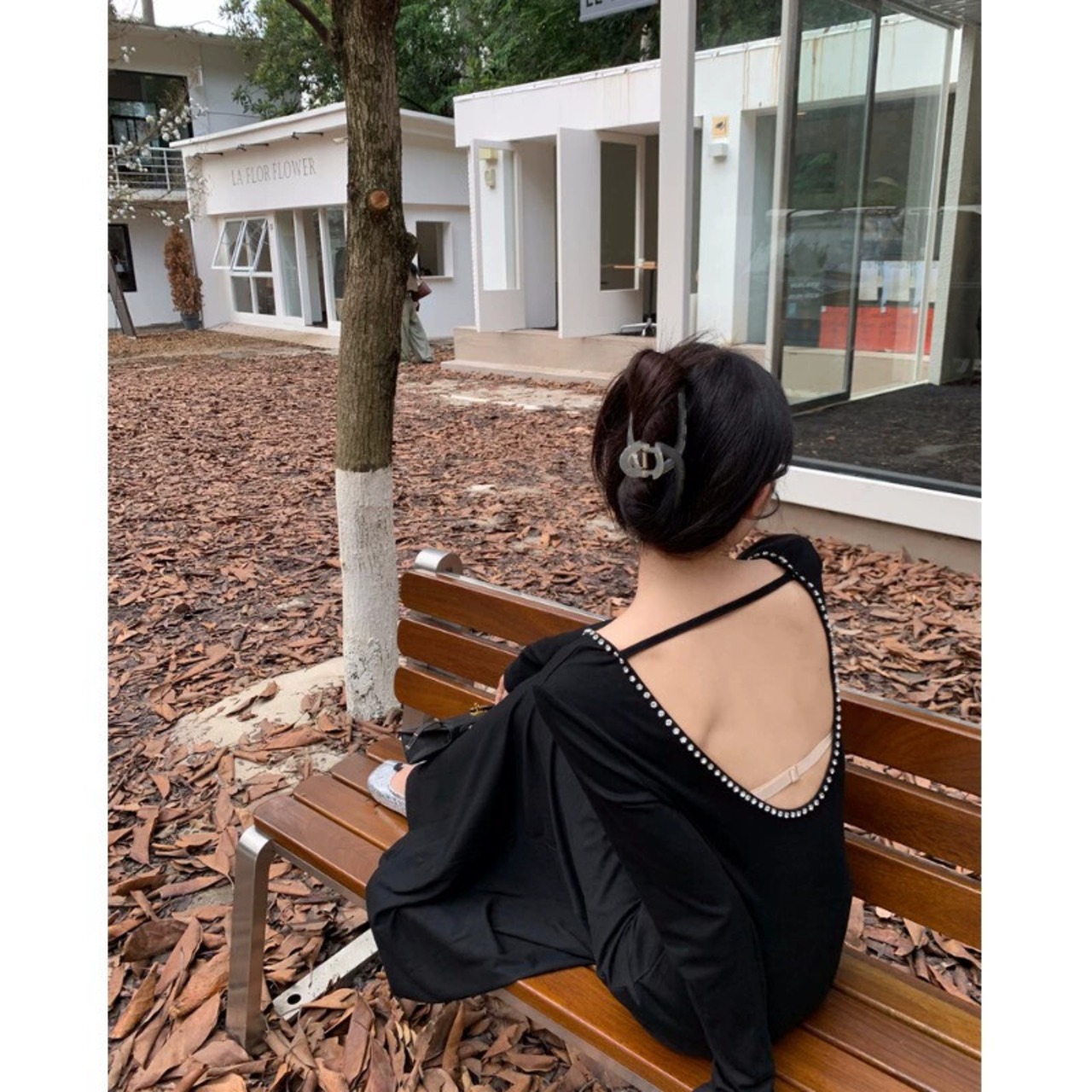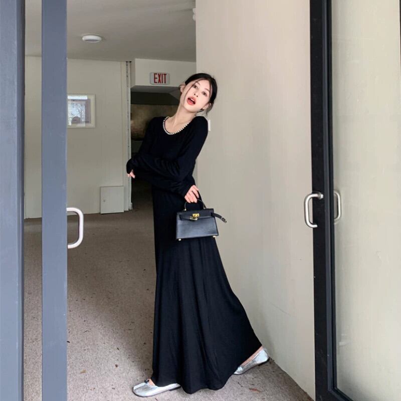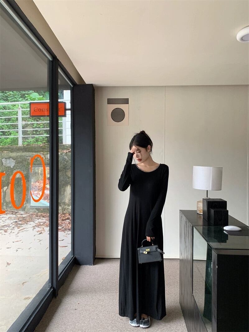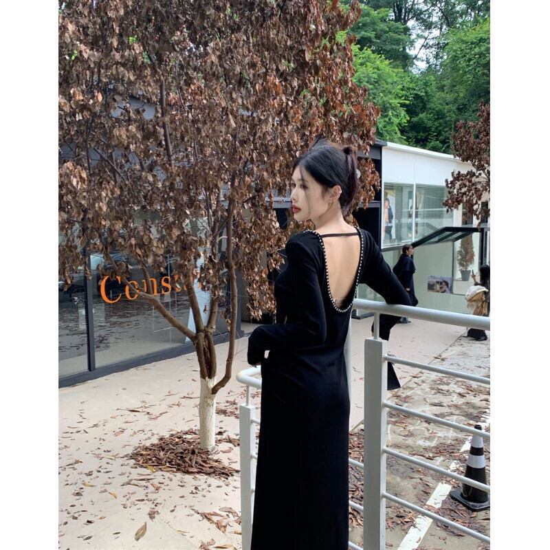 ヘビーデザインビーズ背中の開いた黒のドレスの女性の秋 2023 新しいスタイルのレトロな気質ウエスト痩身ロングスカート ブラック オータム 秋物 0921996822089536