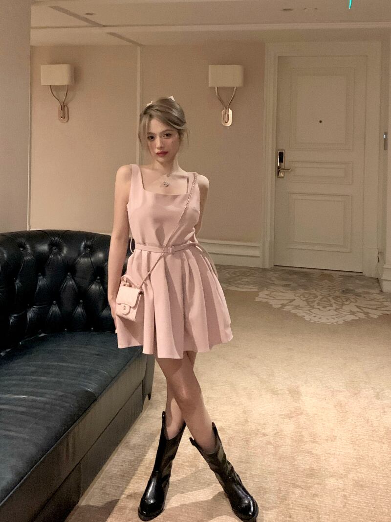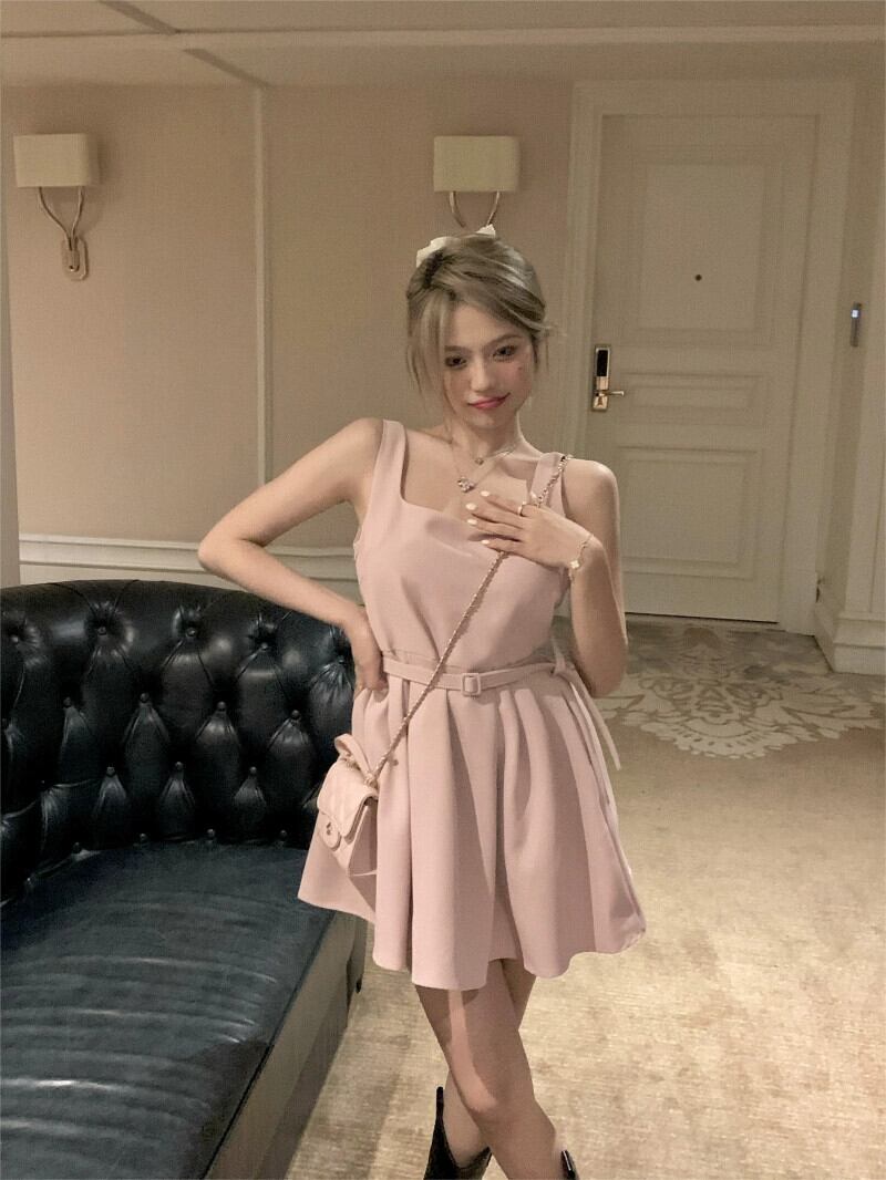 ピンクの甘いスタイルのサスペンダードレスの女性の夏の 2023 新しいスタイルのウエスト痩身と年齢を軽減する A ラインショートスカート 大人ガーリー スウィート キュート カジュアル サマー 夏物 Aライン 0921996843190194