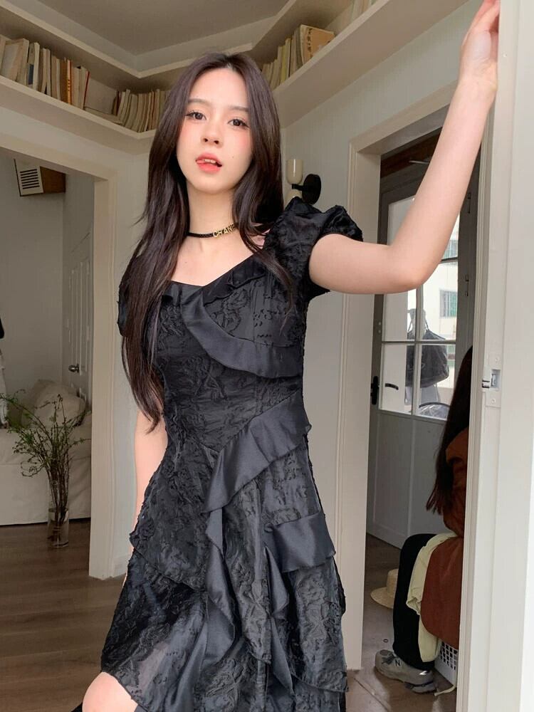 ヘップバーンスタイル半袖ドレスの女性の夏 2023 新しいハイエンド気質セクシーな不規則なフリルスカート サマー 夏物 0921948467643921