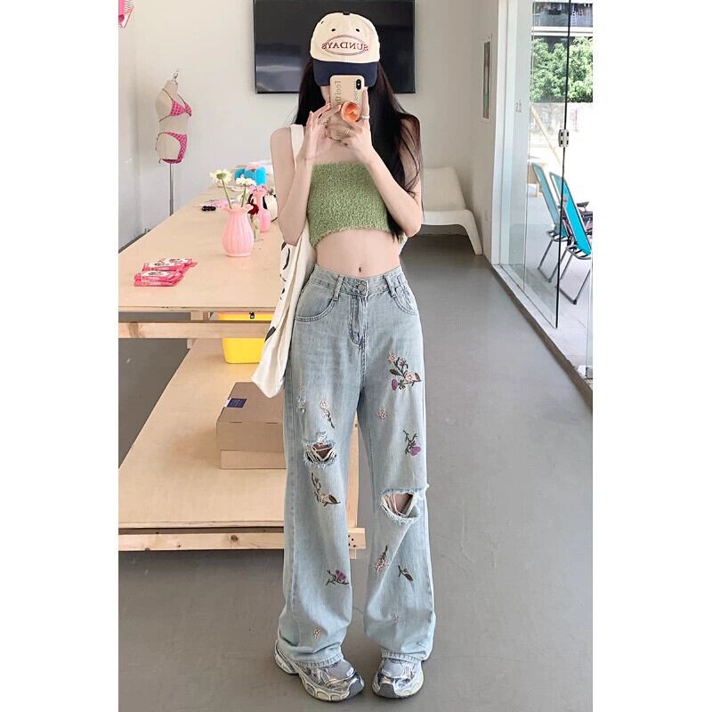 重工業の花刺繍リッピングジーンズ女性夏 2023 新しい多用途ハイウエストルーズ痩身ワイドレッグパンツ レッド サマー 夏物 フラワーデザイン 0921951027805995