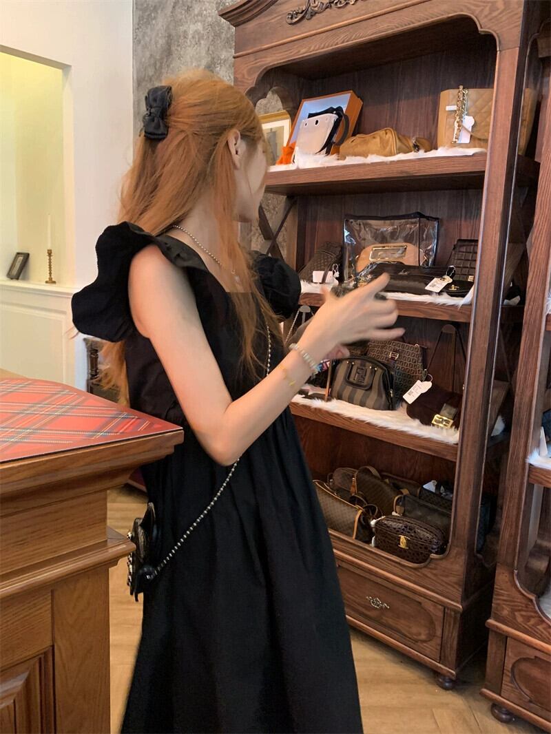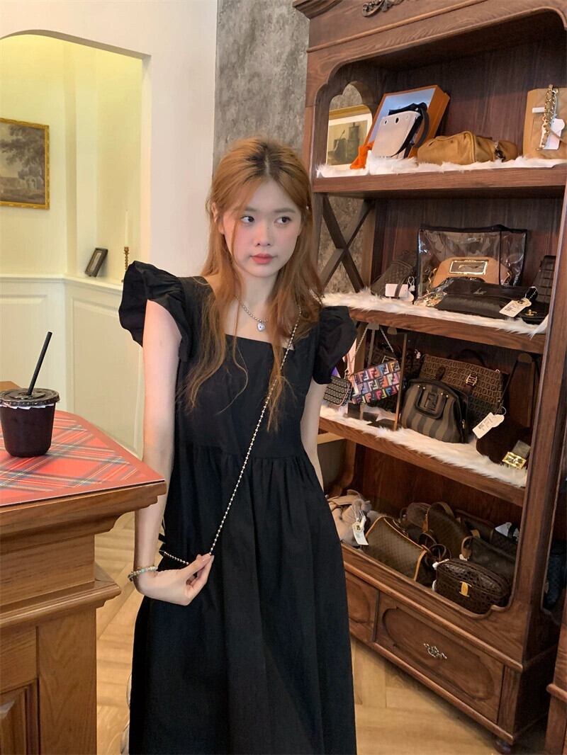 ヘップバーンスタイル黒小さなフライングスリーブホリデードレス女性の夏 2023 新年齢削減気質スクエアネック A ラインスカート ブラック サマー 夏物 Aライン スクウェア 0921945230760493