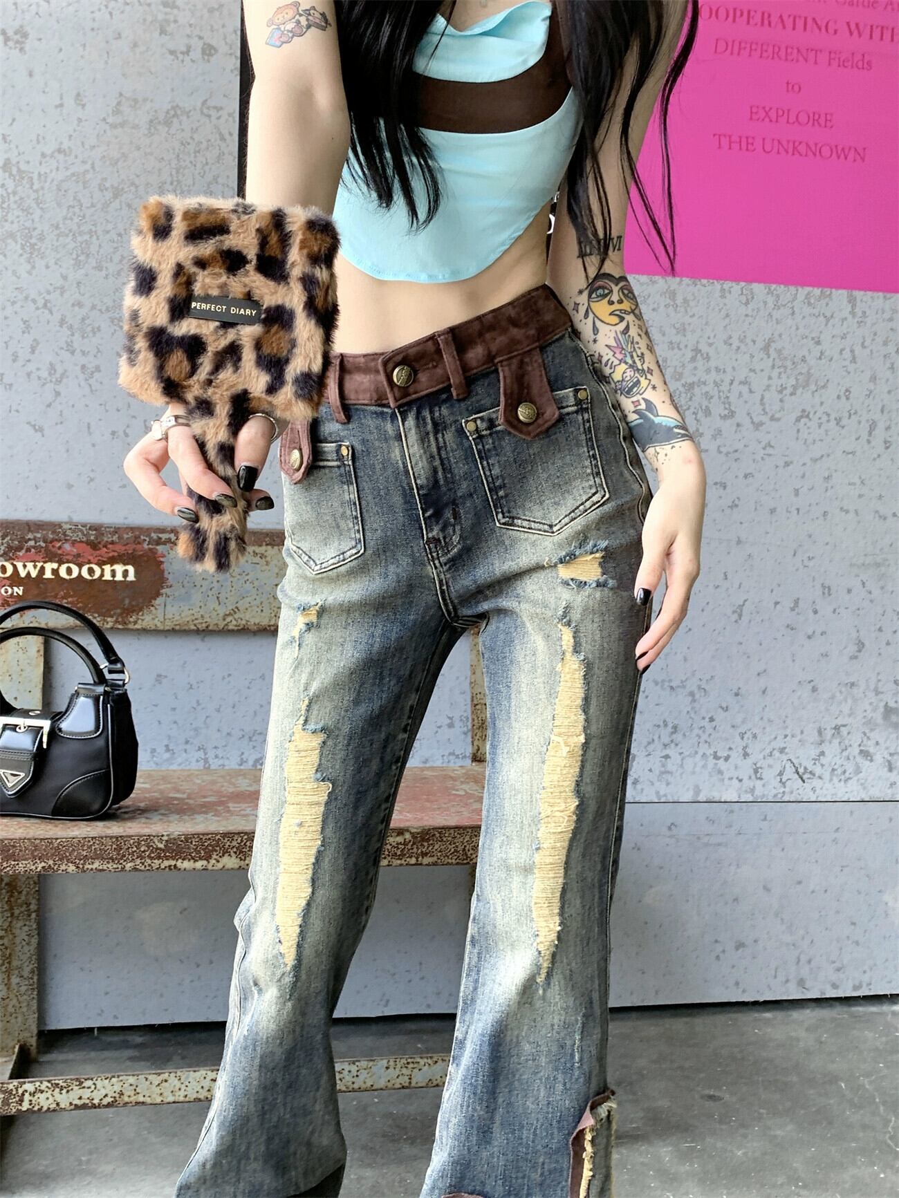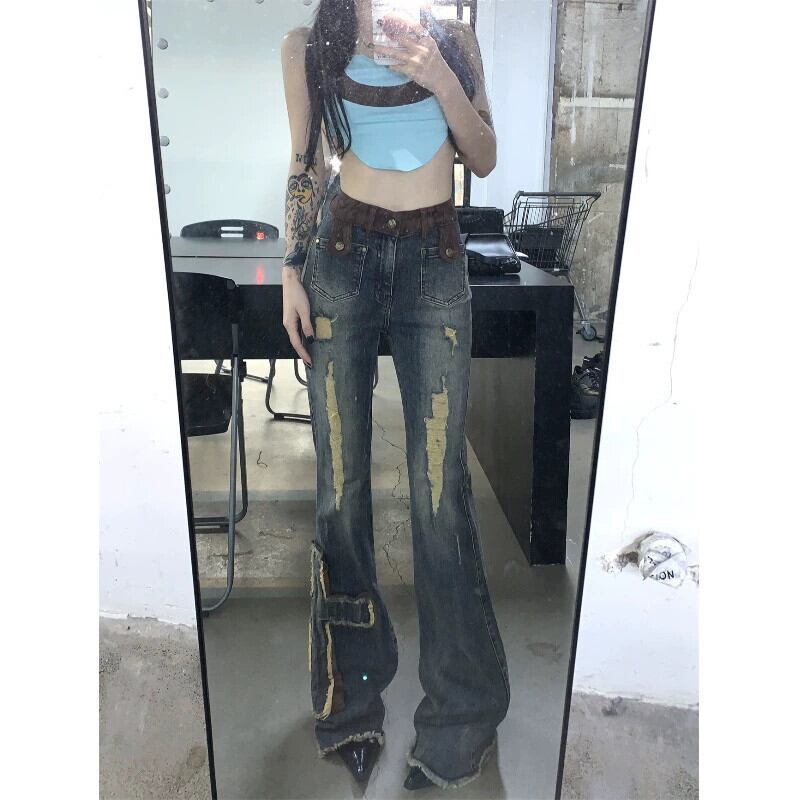 アメリカンインレトロブーツカットジーンズ女性秋ハイウエスト破れたズボンストレッチスリムフィットオールマッチパンツ ハイウェスト オータム 秋物 0921954391532902