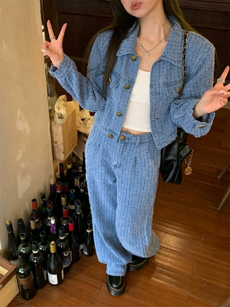 レトロなスタイルのファッションスーツの女性の秋 2023 新しい長袖ジャケットコートハイウエストジーンズ 2 点セット ロング オータム 秋物 092193122203557
