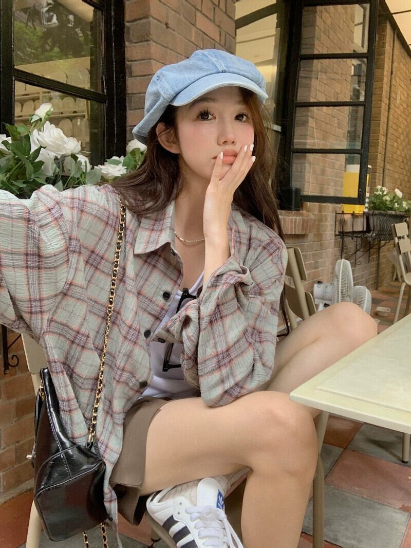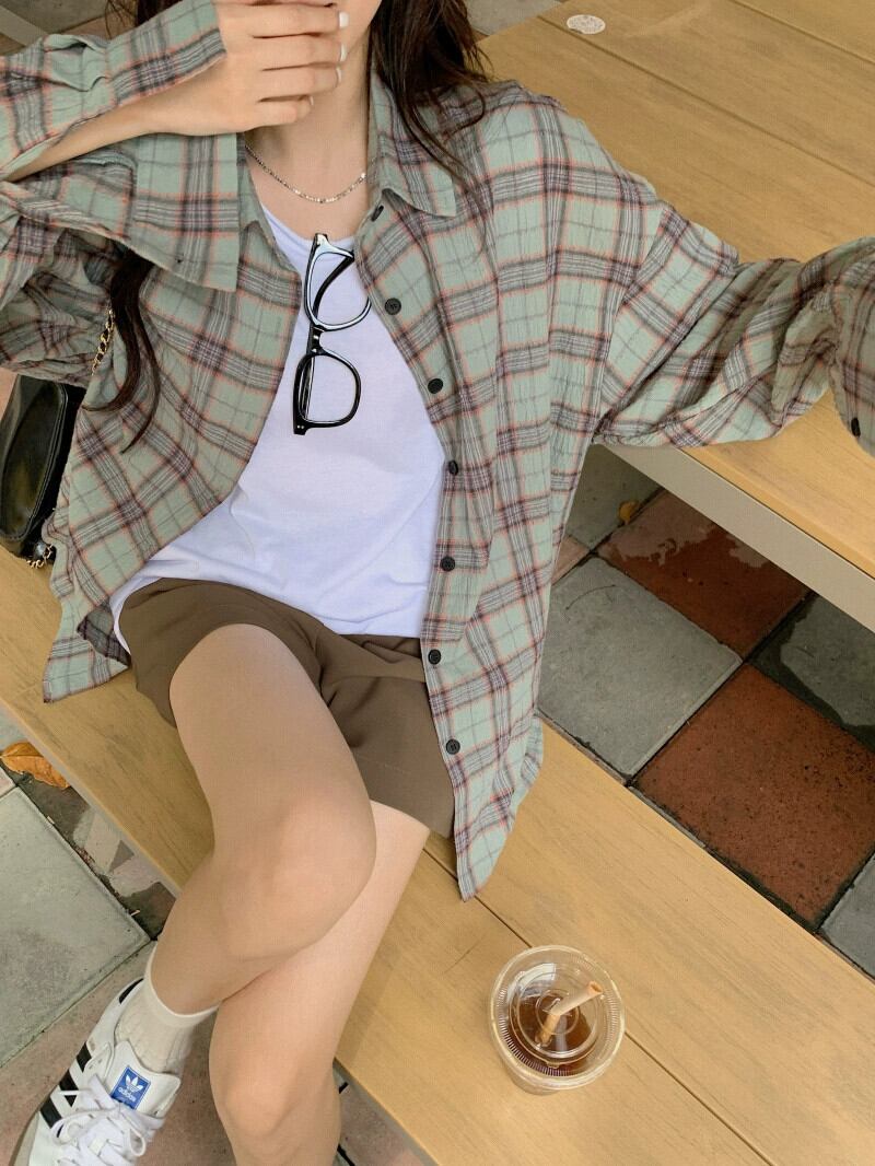 アメリカのレトロなグリーンチェック柄シャツジャケット女性の夏 2023 新しいルーズ BF スタイル長袖ルーズ多目的シャツ ロング サマー 夏物 0921986570953146