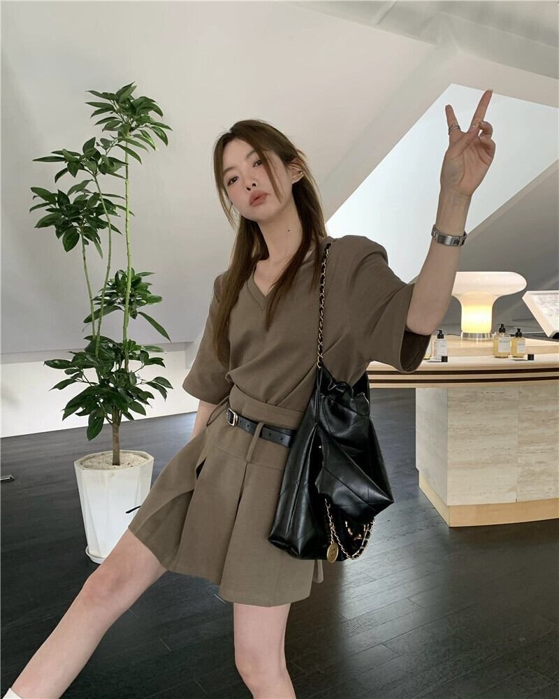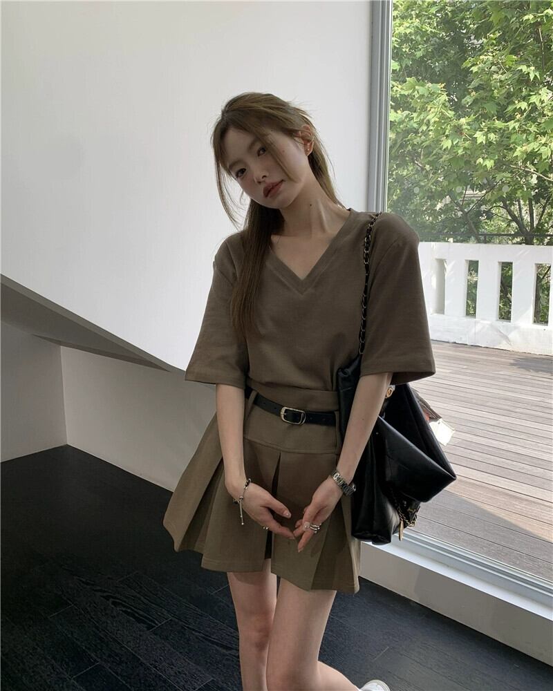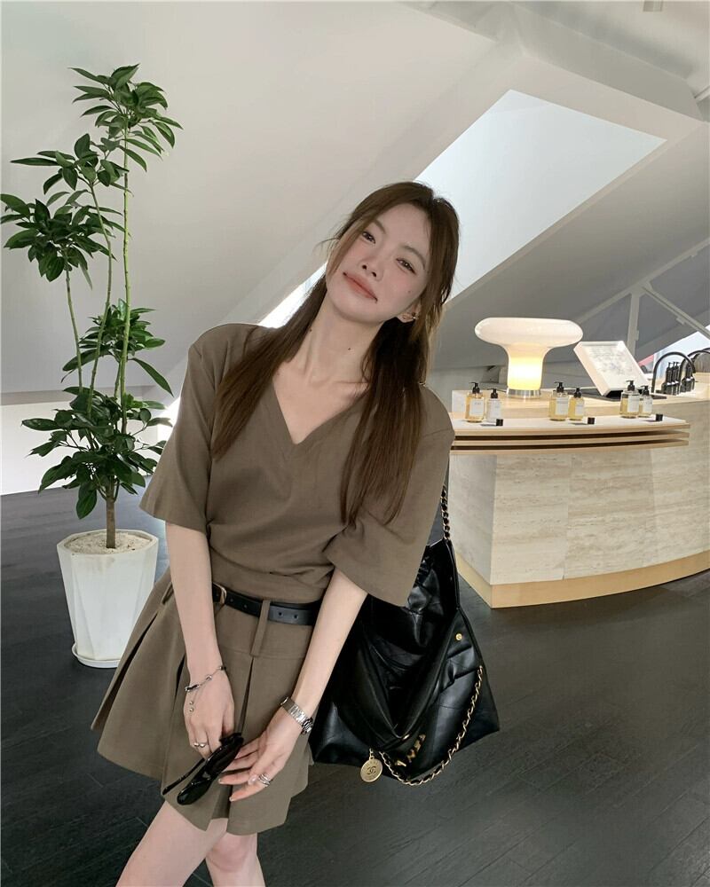 シックなファッションスーツスカート女性の夏の 2023 新しい V ネック半袖 Tシャツプリーツスカート 2 点セット サマー 夏物 Vネック 0921933109476150