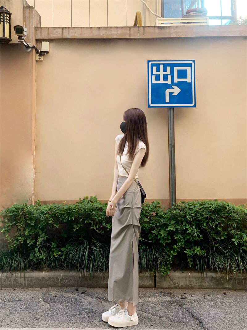 ホットカジュアルスーツスカートレディース 2023 夏の新作ラウンドネックスリム半袖 Tシャツスリットスカート 2 点セット サマー 夏物 Oネック 0921929465507337
