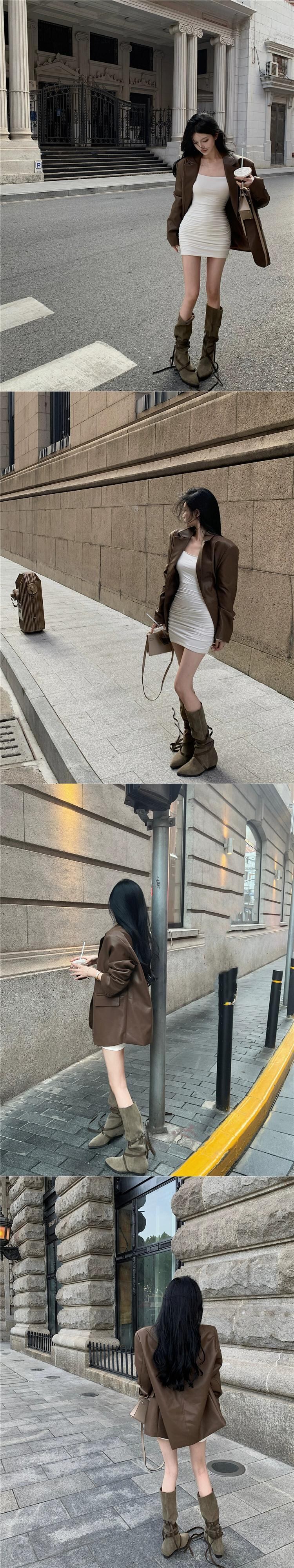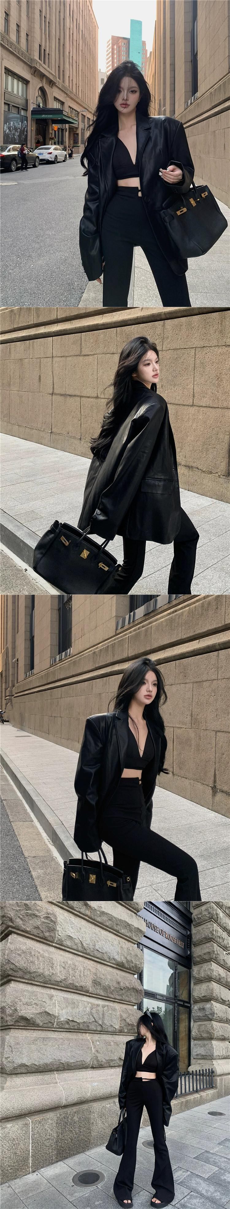 クールでクールな長袖レザースーツジャケット女性 2023 秋の新スタイルミッドレングスルーズでスリムなスーツトップトレンディ ロング オータム 秋物 0921935749246348