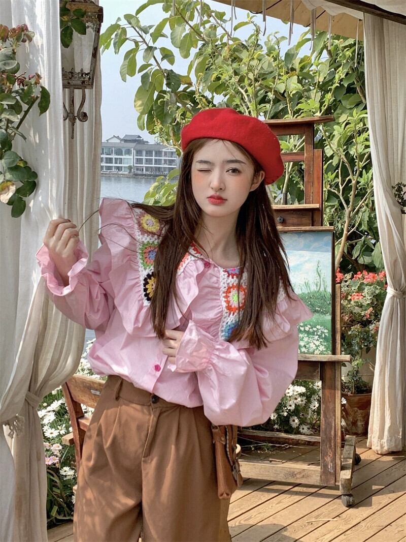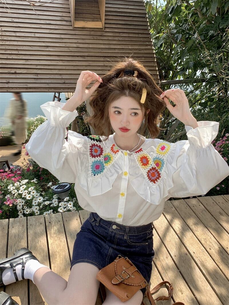 厚手のフラワードールカラー長袖シャツの女性の秋2023新しいスタイルの年齢を軽減する多用途のルーズシャツ ロング オータム 秋物 フラワーデザイン 0921981934440916