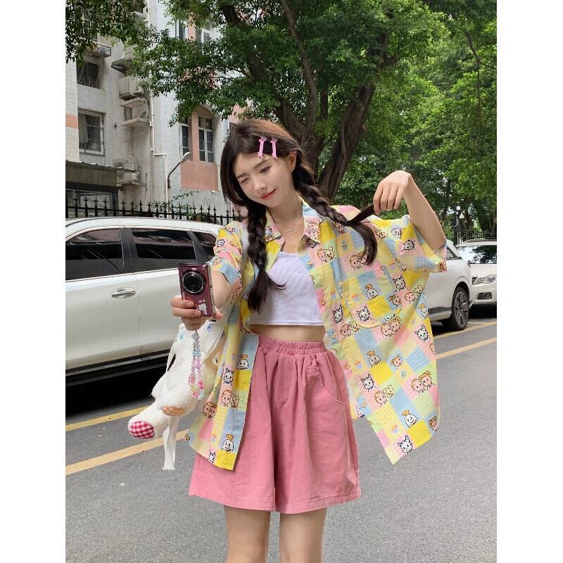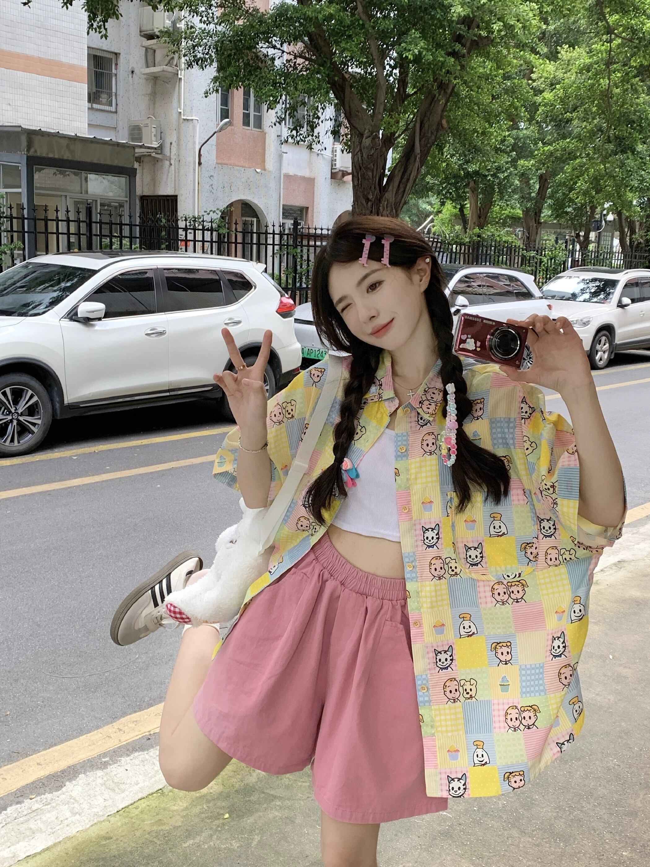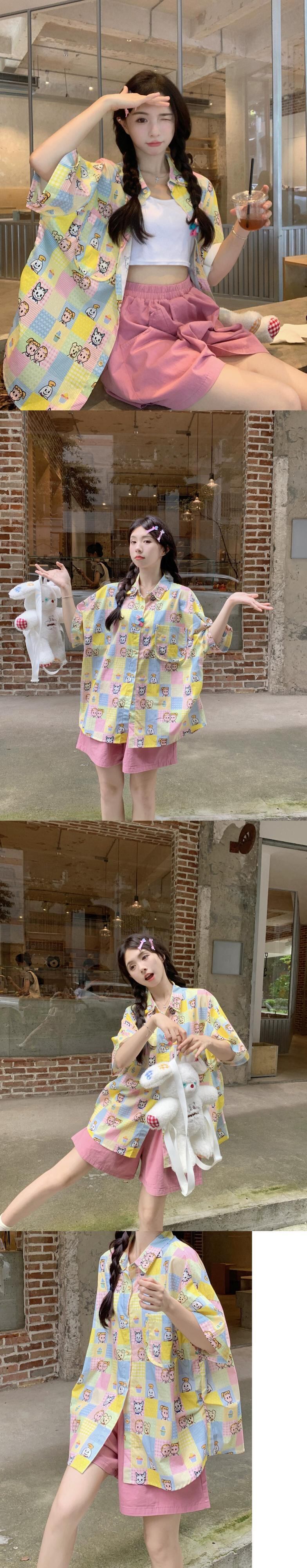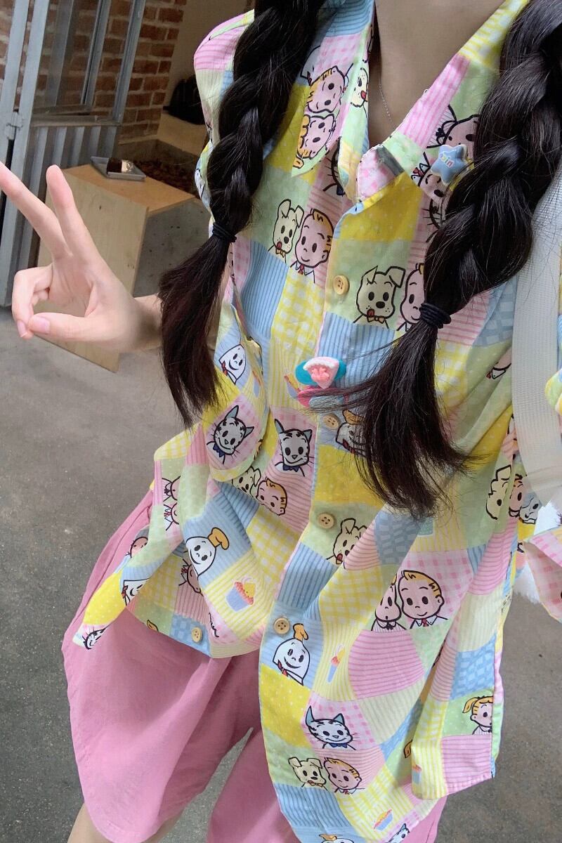 楽しい漫画プリント半袖シャツ女性の夏甘いネクタイルーズミッドレングスシャツ年齢を軽減するニッチトップス 大人ガーリー スウィート キュート カジュアル サマー 夏物 0921970324924898
