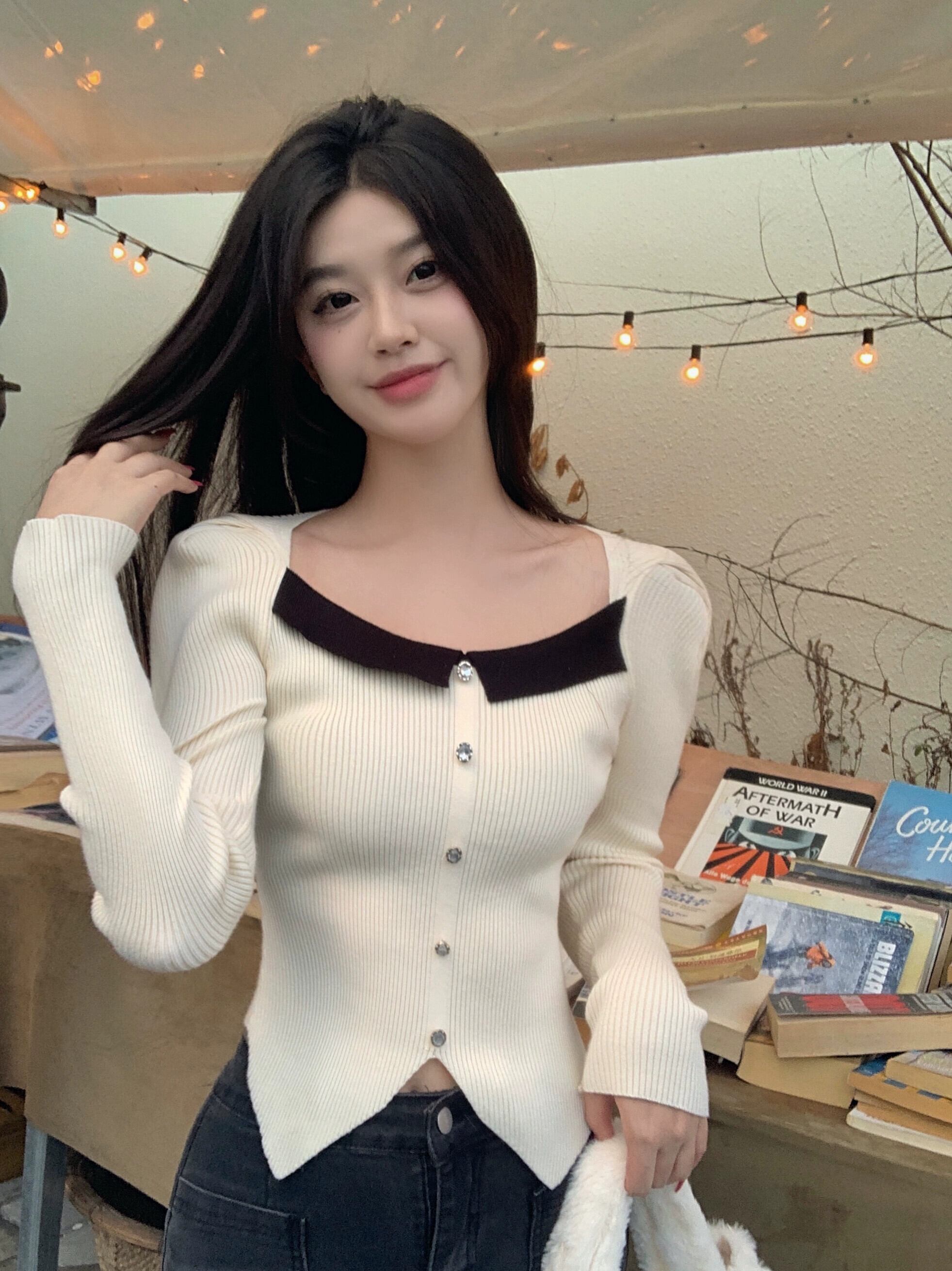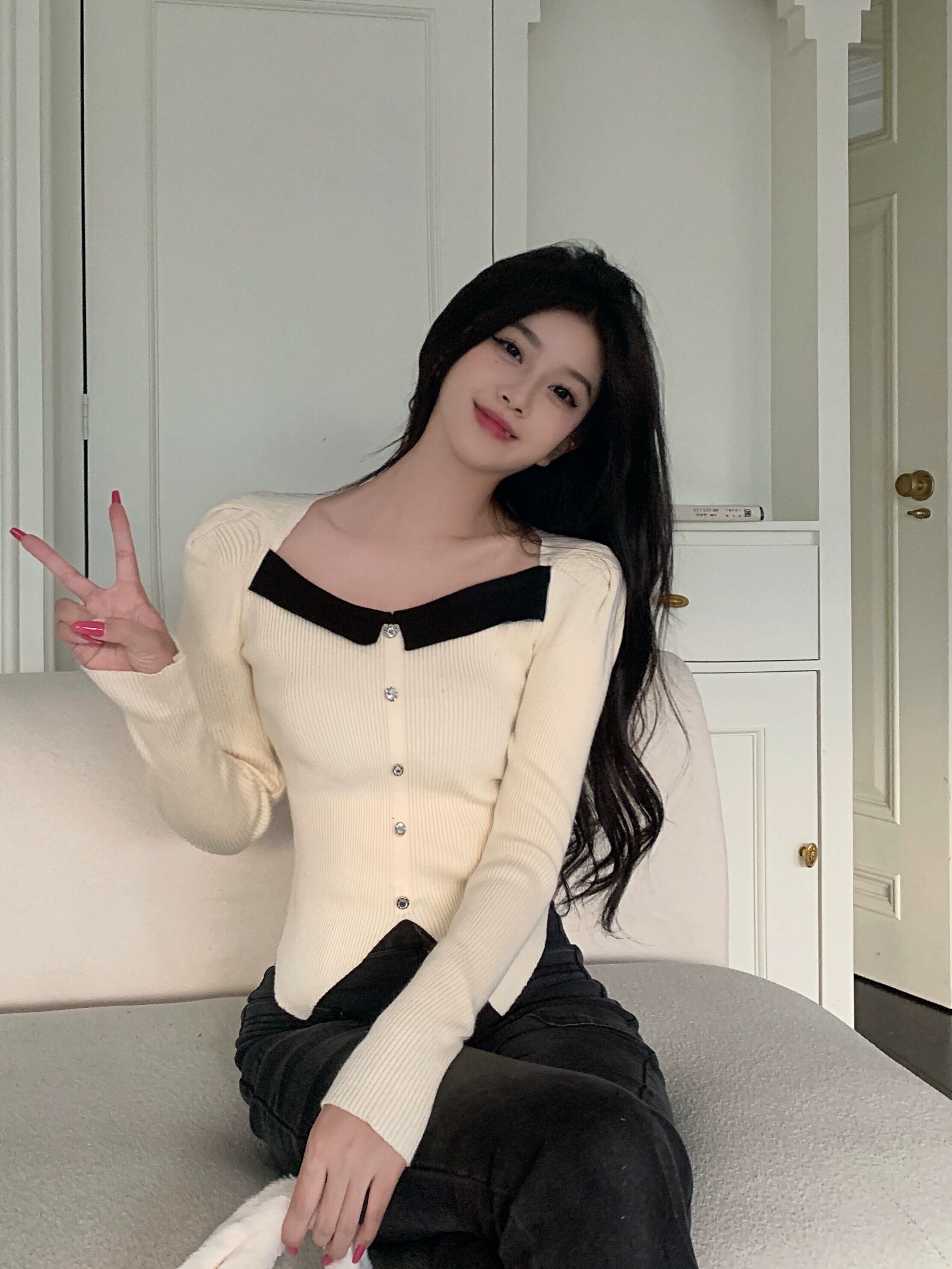 フレンチスタイルのスクエアカラーコントラストカラー長袖セーターの女性の秋2023新しいスリムフィットスリットショートトップ ロング オータム 秋物 スクウェア 0921916016947485
