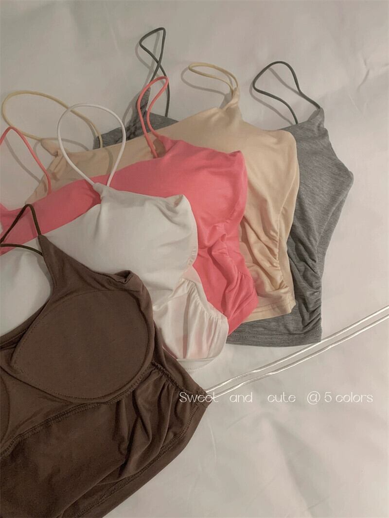 ソリッドカラーの多用途デザインプリーツキャミソールレディース 2023 年夏新しい胸パッド付きスリムフィットトップ サマー 夏物 0921947188436330