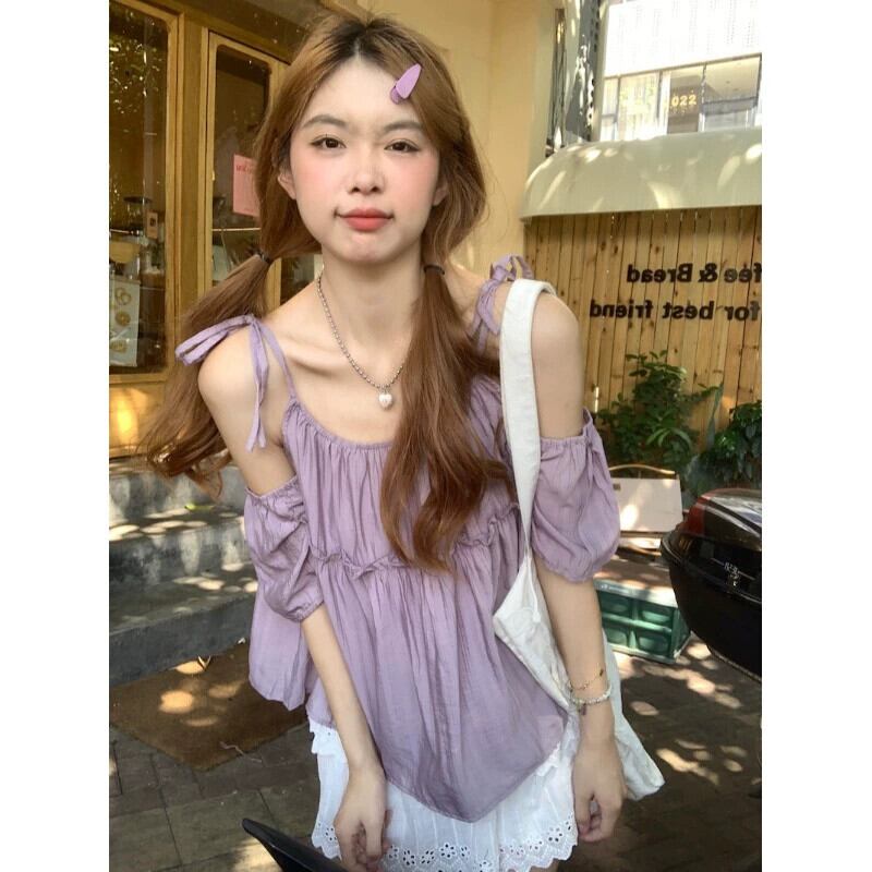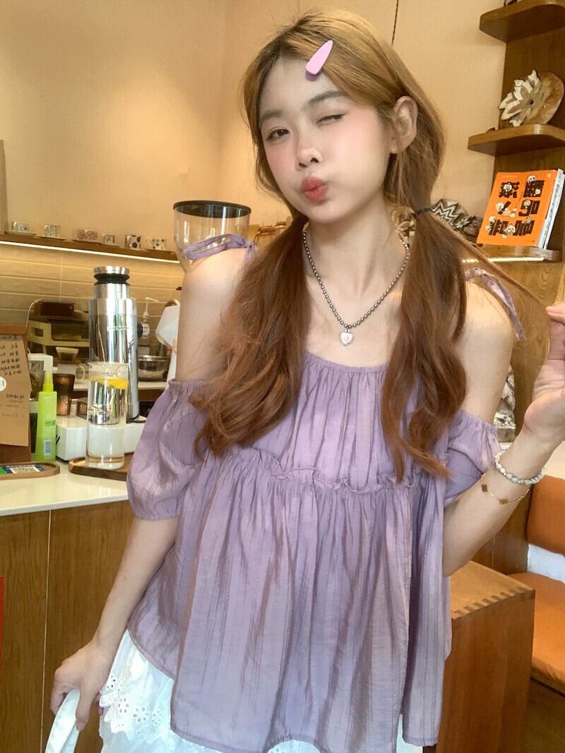 オフショルダーストラップワンショルダー半袖シャツ女性夏紫シャツデザインニッチルーズベビードールトップ サマー 夏物 パープル 0921948692018284