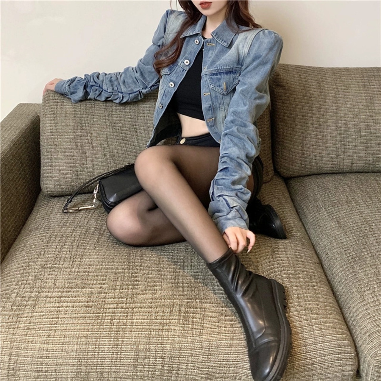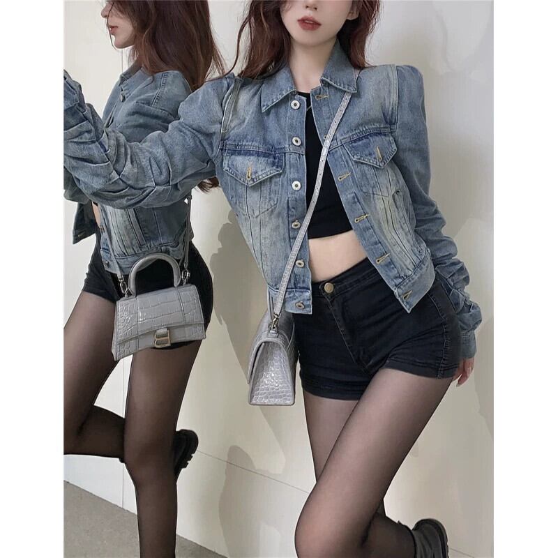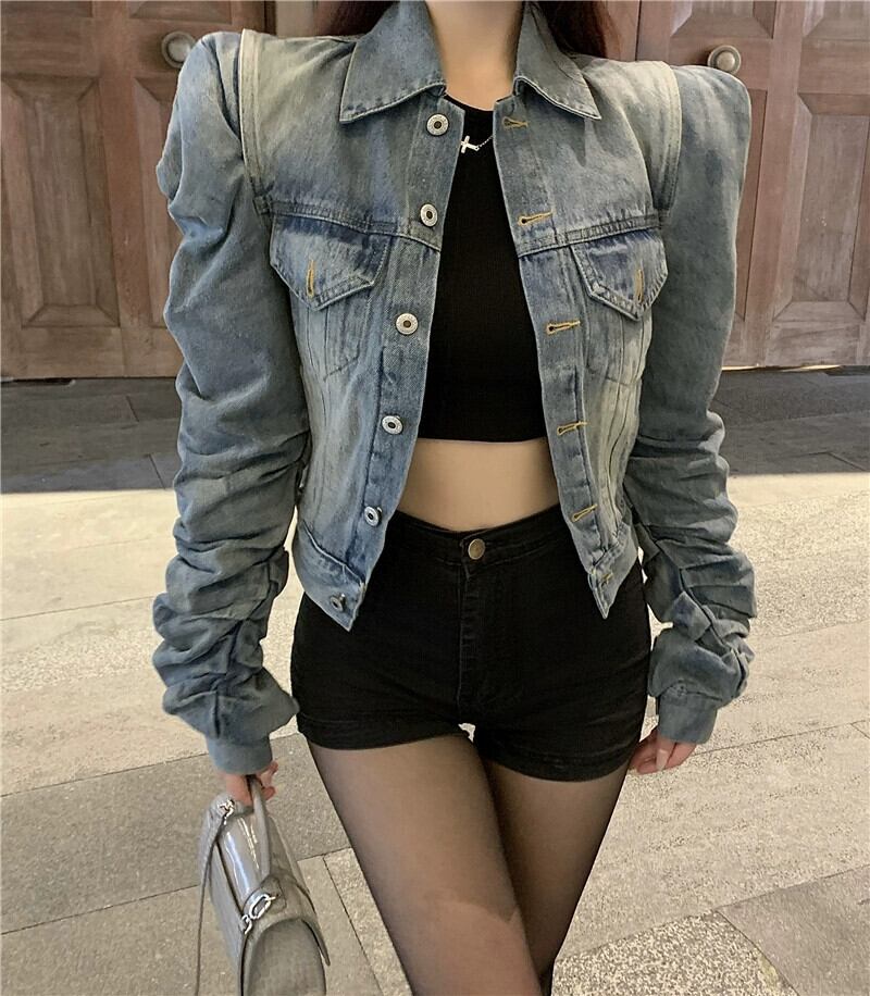 レトロなデザインのプリーツ長袖デニムジャケットの女性の秋 2023 新しいスタイルショートルーズスリムカーディガントップ ロング オータム 秋物 0921920104693250