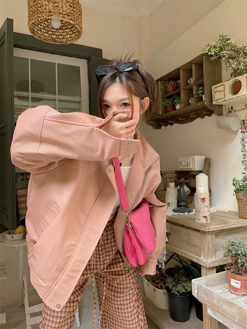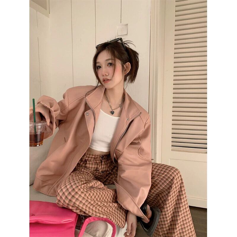 気質スタンドカラーオートバイレザー長袖ジャケット女性の初秋 2023 多用途ルーズスリムジャケットトップ ロング オータム 秋物 0921945398014712