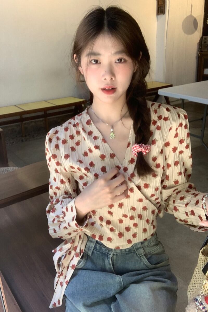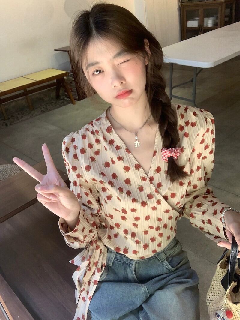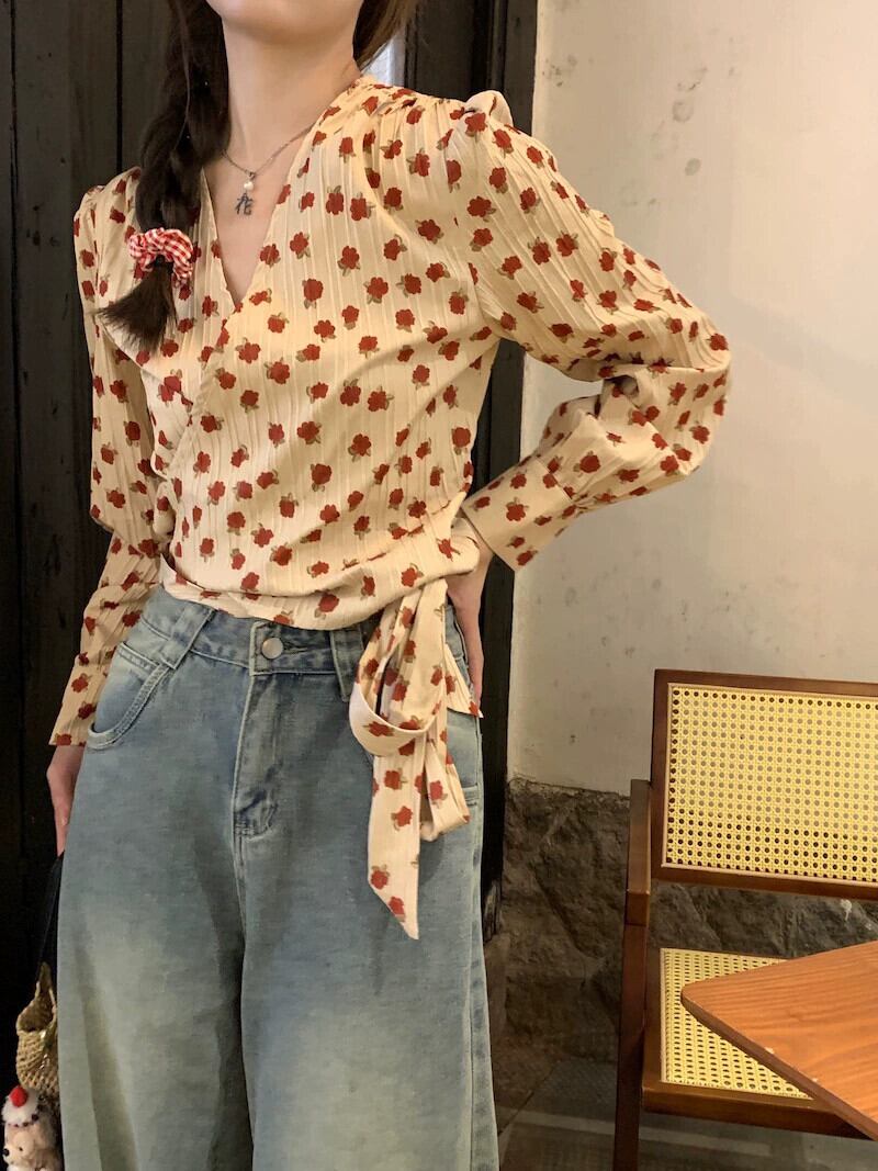 フレンチレトロ V ネック長袖花柄シャツ女性の 2023 秋の新作レースアップウエストショートシャツトップ ロング オータム 秋物 Vネック 0921951161179901
