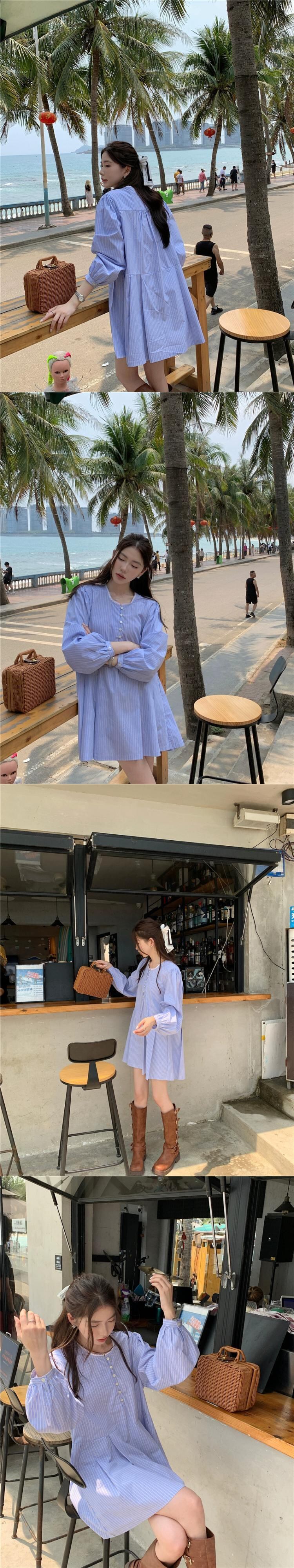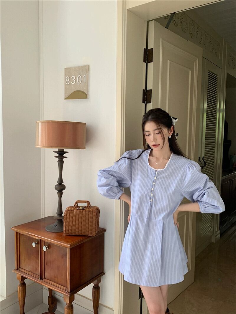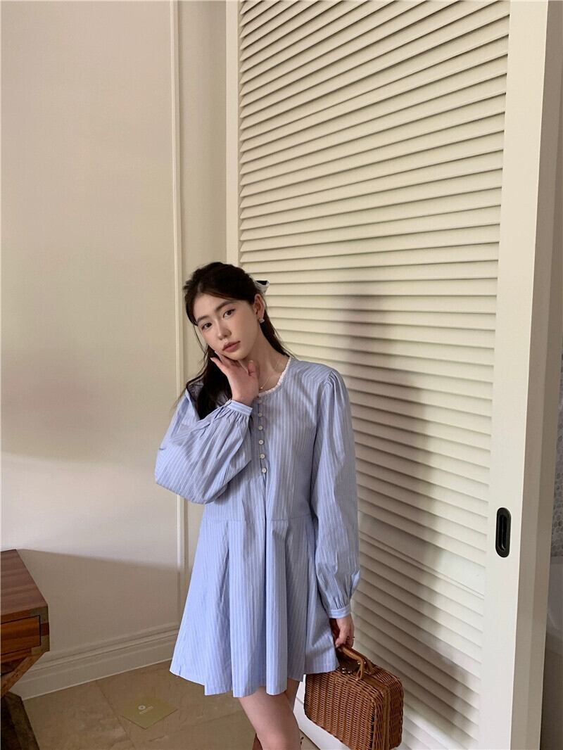 シックな気質長袖ラウンドネックストライプドレス女性の夏の 2023 新しいルーズでスリムなプリーツスカート ロング サマー 夏物 Oネック 0921972465158557