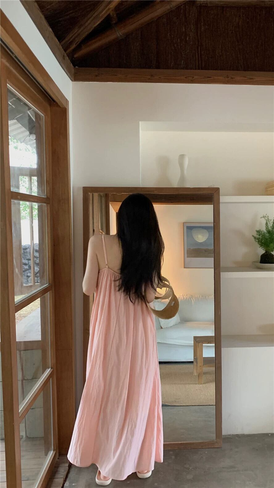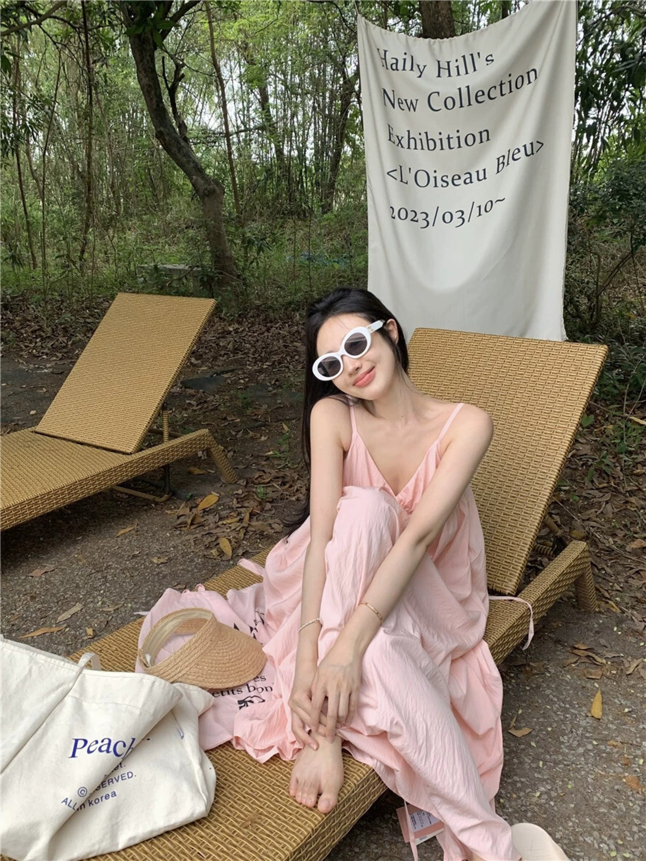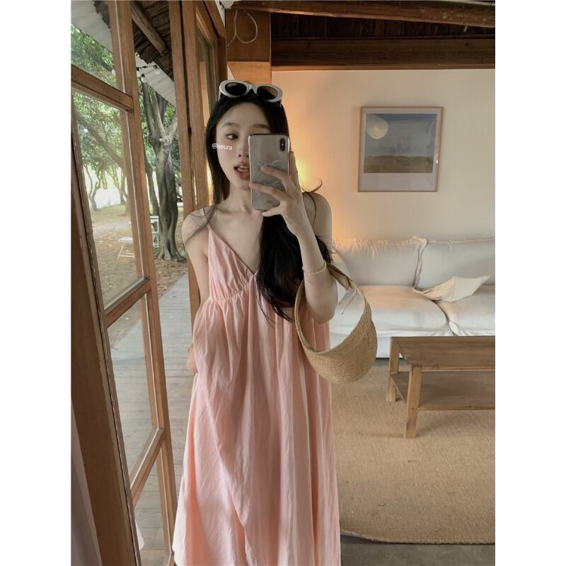 ピンクの v ネックサスペンダードレスの女性の夏の 2023 新しいルーズスカート気質ハイエンドノースリーブロングスカート サマー 夏物 Vネック 0921988784977808