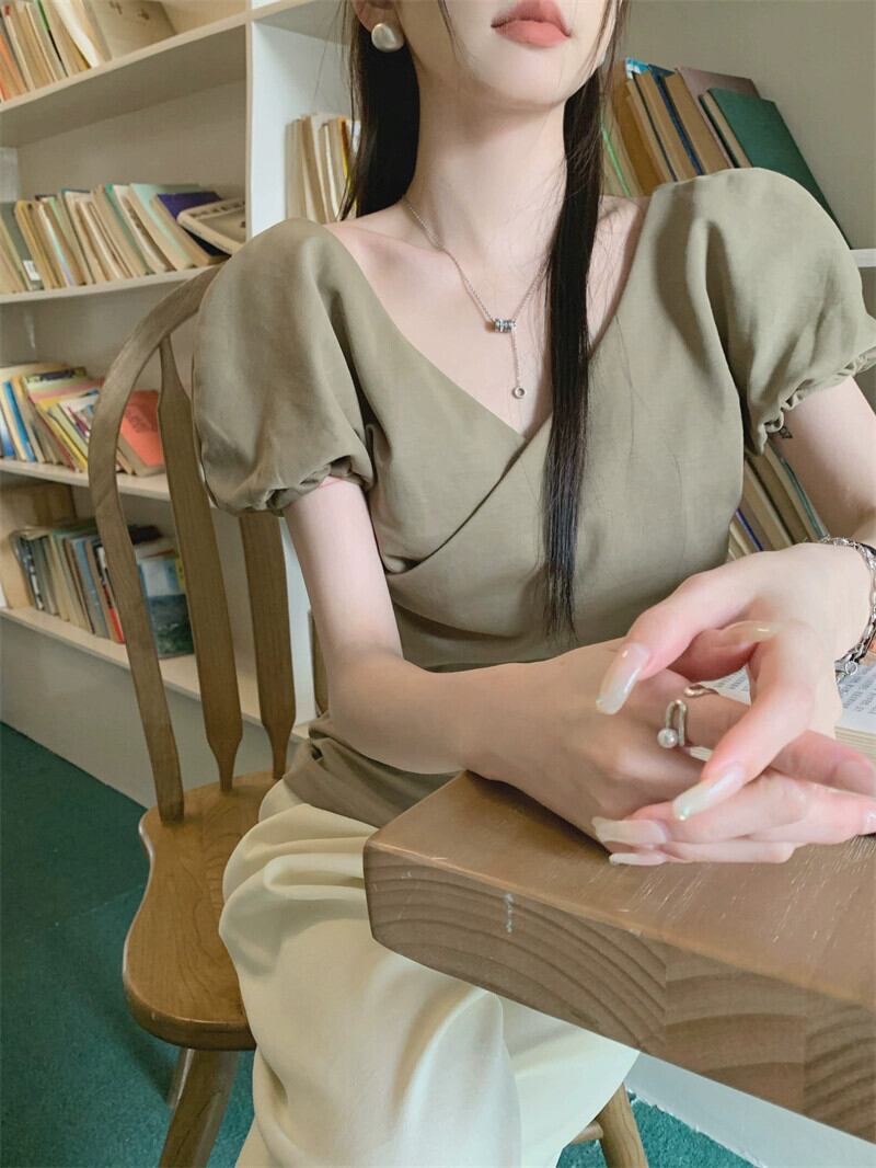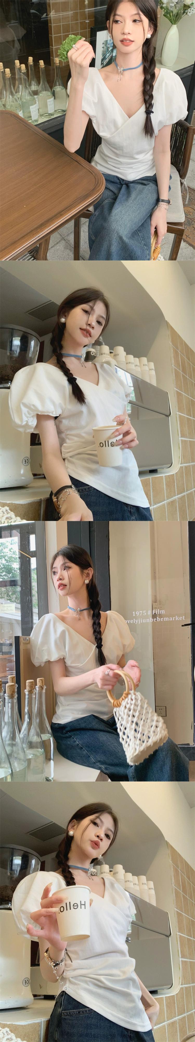 -end Vネックバブル半袖Tシャツレディース2023年夏新デザインニッチ不規則ショートトップ サマー 夏物 0921917686734540