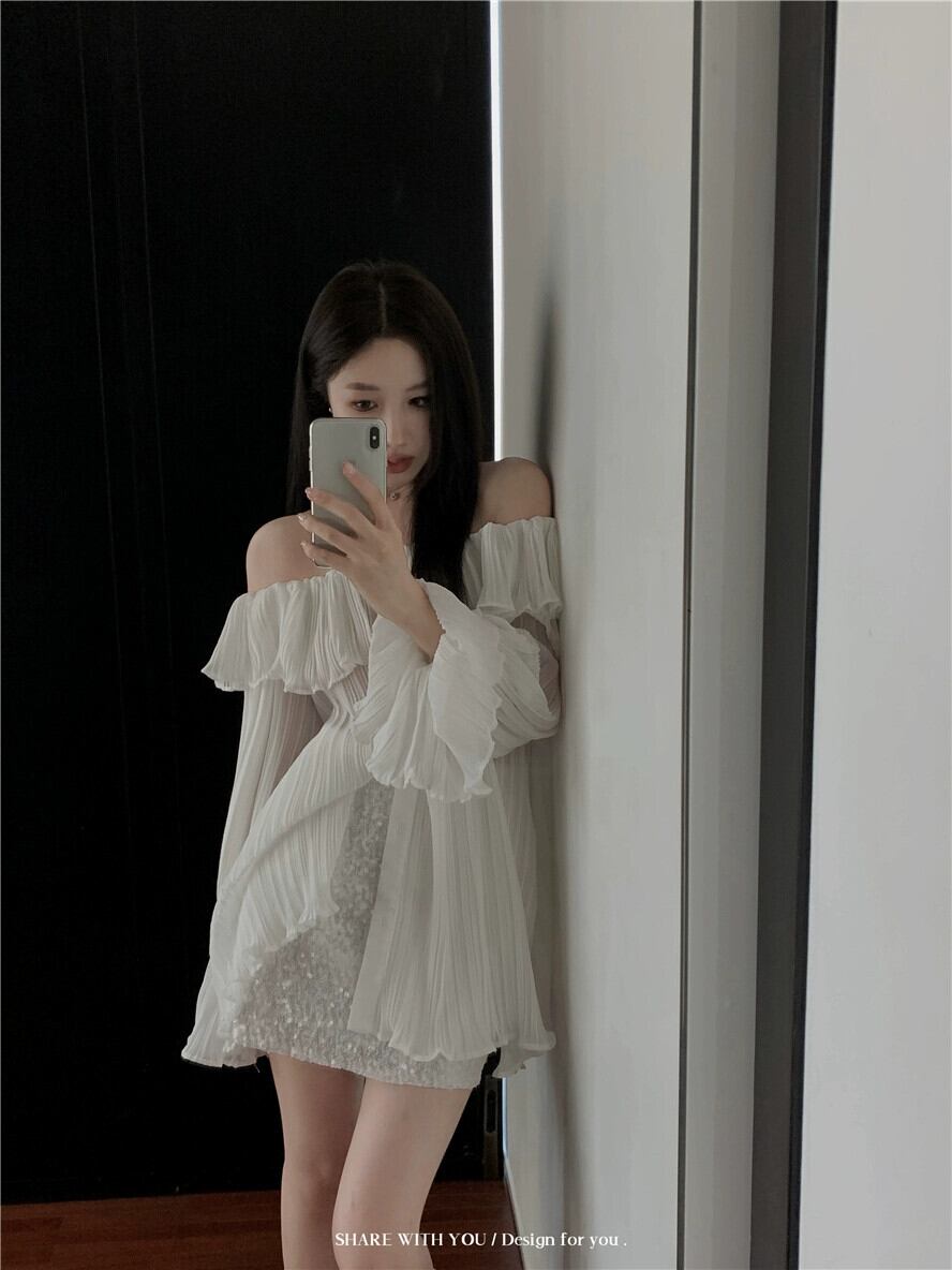 優しいスタイルのファッションスーツの女性の夏の 2023 新しいワンショルダーシャツスパンコールスカート 2 点セット サマー 夏物 0921955858323733