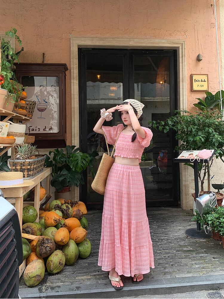 優しいピンクの気質ファッションスーツの女性の夏 2023 新しいスタイルパフ半袖トップハイウエストスカート 2 点セット サマー 夏物 0921959994507578
