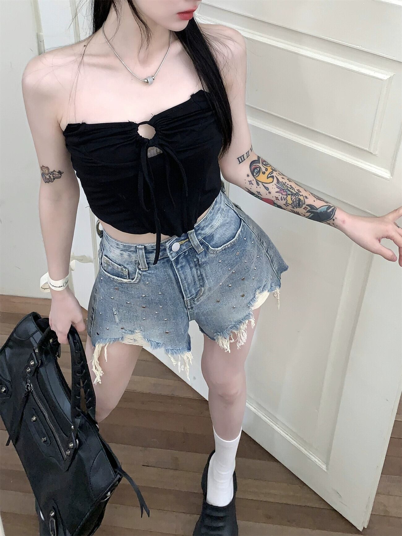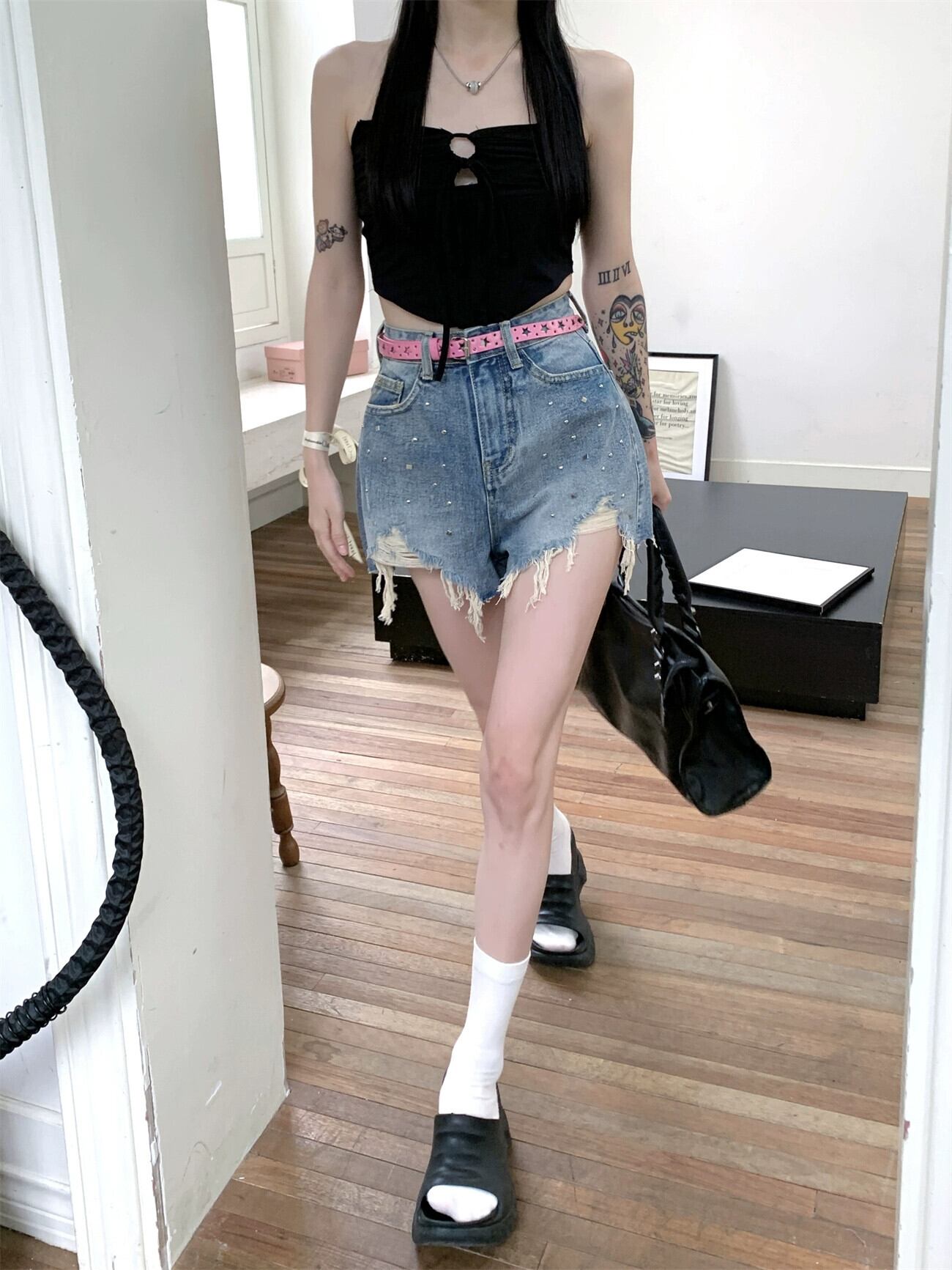 ニッチデザインビーズローエッジデニムショートパンツ女性サマーパンツルーズハイウエストワイドレッグ痩身パンツ ハイウェスト 夏物 ショーツ ブルマー ワイドパンツ 0921968184619143