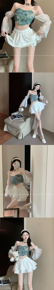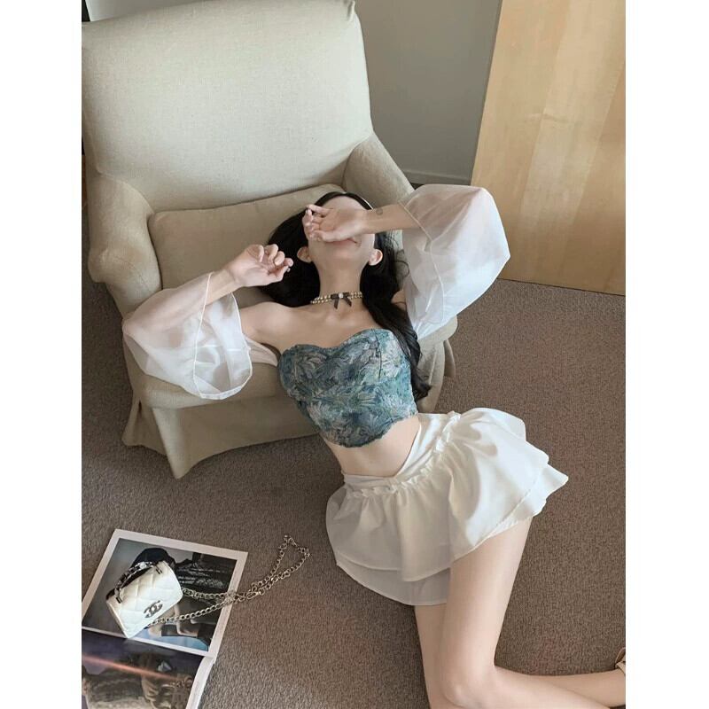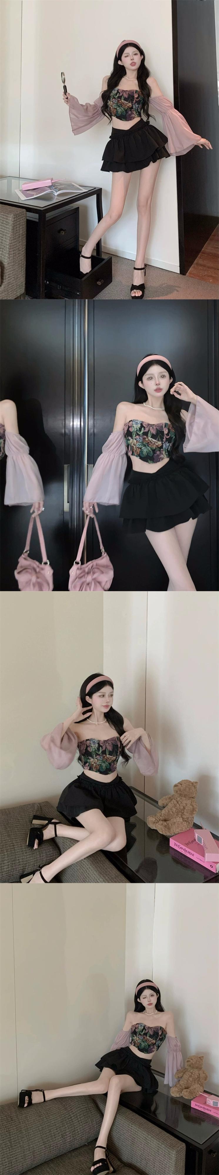 スイートタイ花柄チューブトップワンショルダー長袖トップスフェアリーサマーふくらはぎスカートキュロットプリーツスカート2点セット ロング 大人ガーリー スウィート キュート カジュアル 夏物 0921974717602967