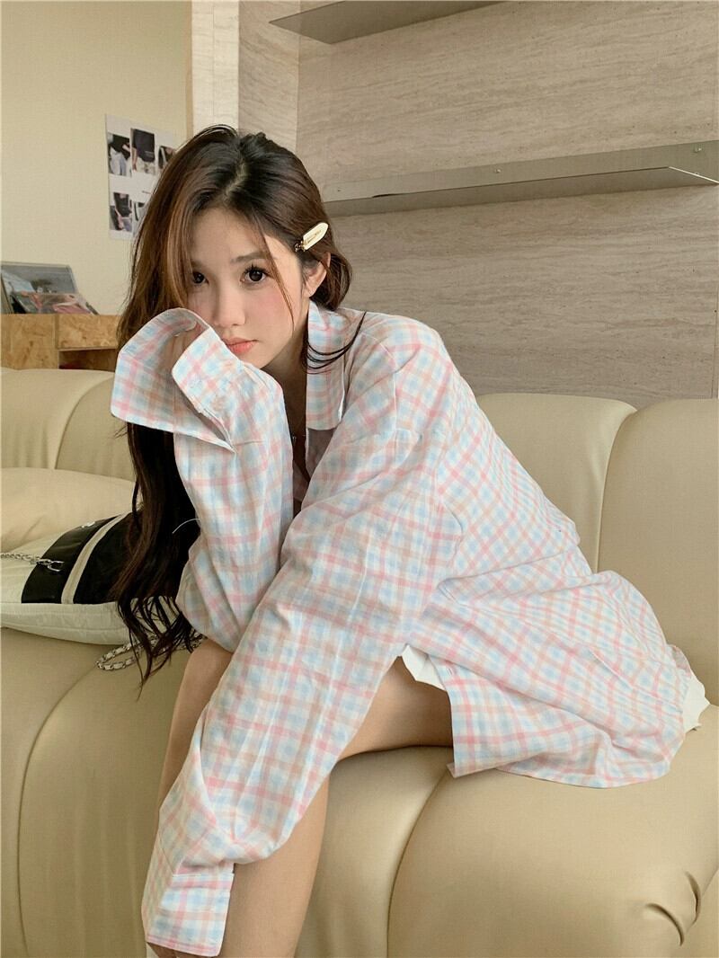 小さな新鮮な長袖チェック柄日焼け防止シャツジャケット女性初秋 2023 新しい甘いルーズミッドレングストップ ロング 大人ガーリー スウィート キュート カジュアル オータム 秋物 0921929076695529