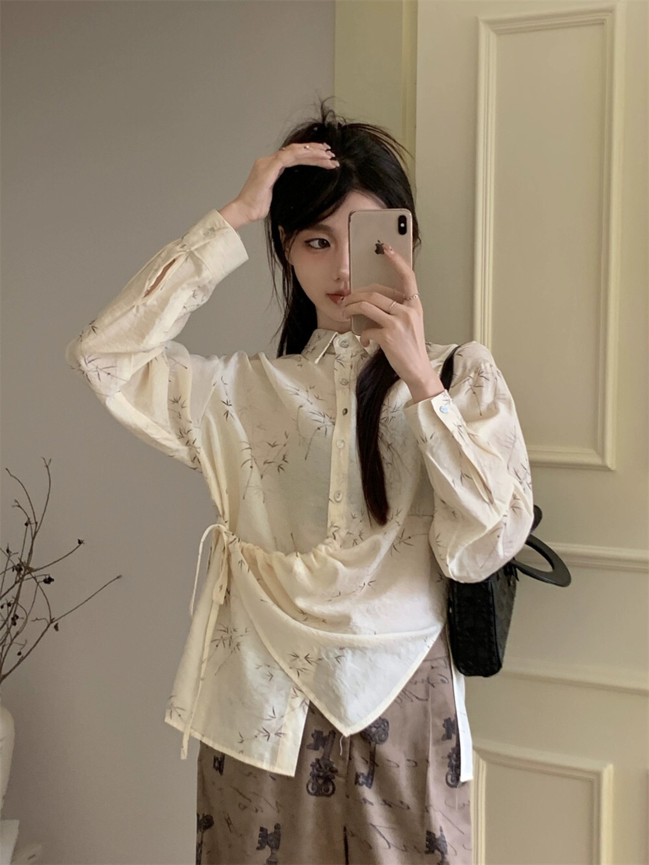 ニッチなレトロなインクプリント長袖シャツの女性の秋のルーズでスリムなミッドレングスデザインの巾着トップ ロング オータム 秋物 092195152560365